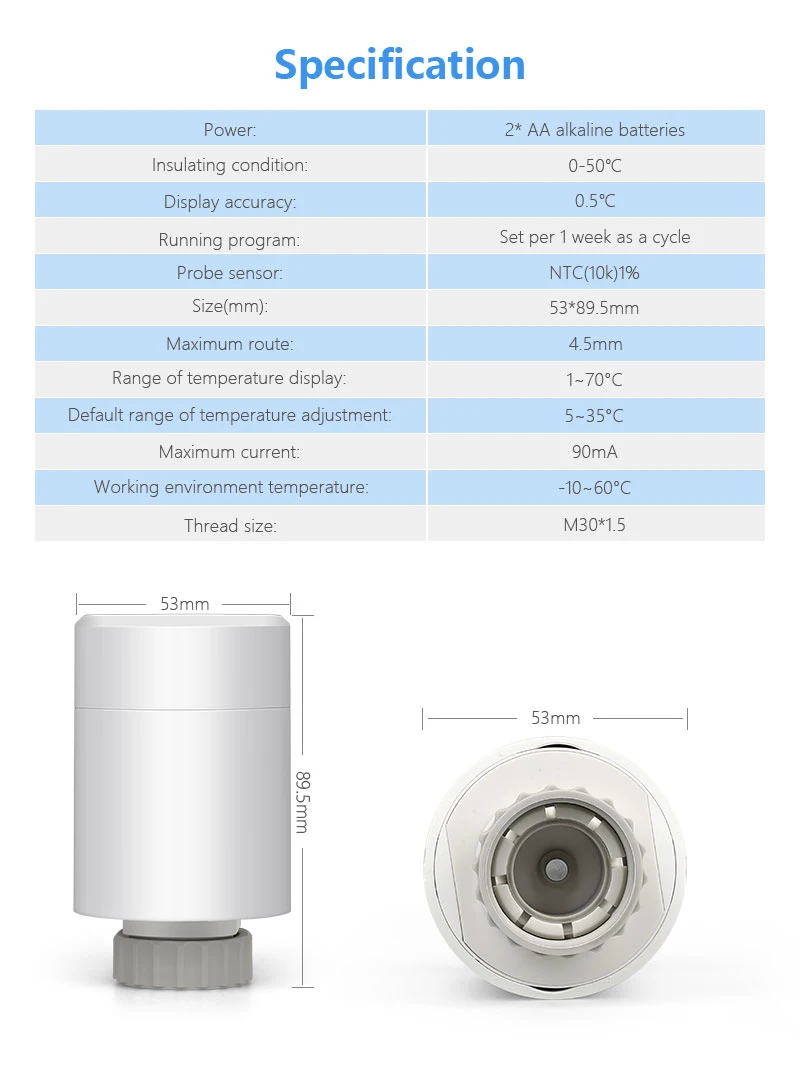 4.Smart Tuya ZigBee 라디에이터 온도 조절기: 라디에이터 온도 조절기는 간단한 설정을 위해 쉽게 새로 추가 된 손잡이가있는 LCD 디지털 디스플레이 화면입니다. 그것은 AA 배터리의 두 부분으로 설계되었으며, 에너지 절약을 위해 난방용 라디에이터와 함께 사용하는 특수 밸브입니다. 인위적으로 실내 온도를 설정합니다. 주로 파이프의 닫힘과 개방을 제어하기 위해 바닥 난방 시스템에 사용됩니다.