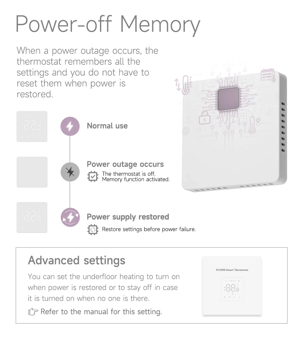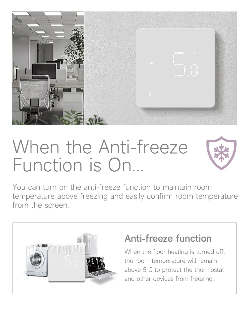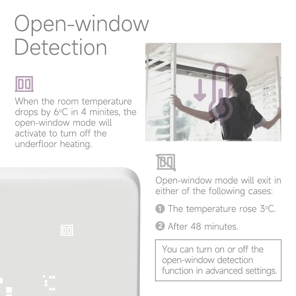 【 열림-창문 감지 】 온도 컨트롤러가 실내 온도가 4 분 이내에 6 도 떨어지는 것을 감지하면 창 열기 기능이 활성화되고 온도 컨트롤러가 난방을 중지하여 에너지를 절약합니다.