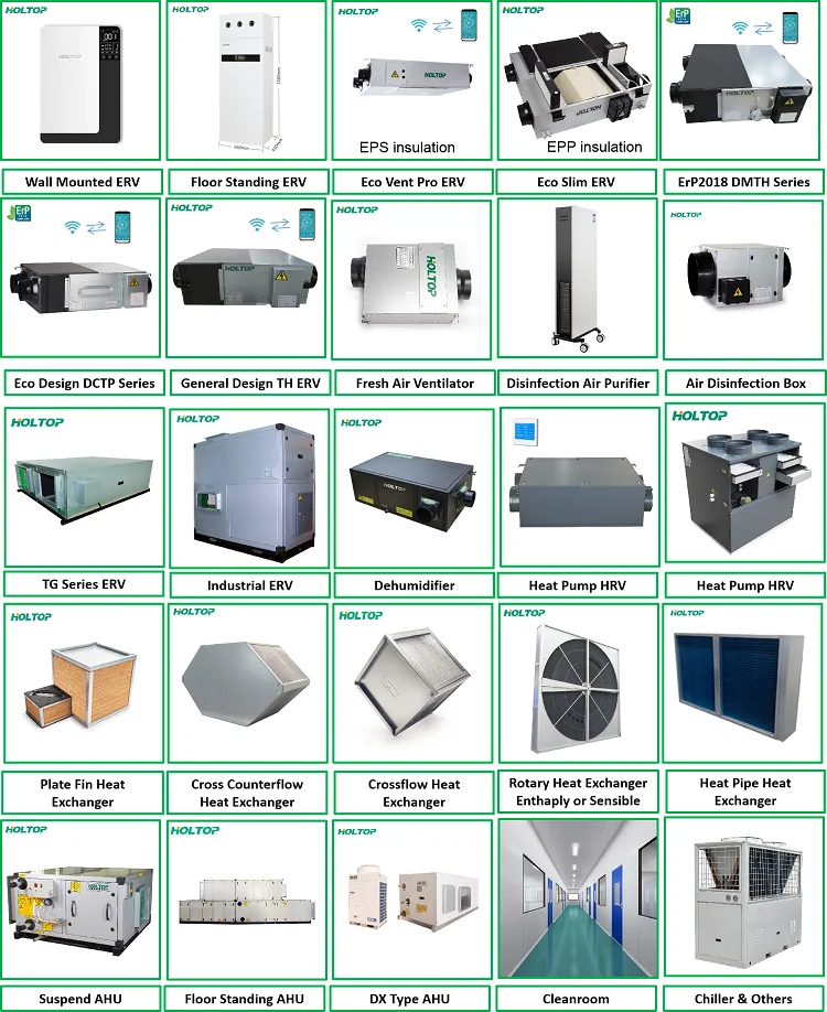 주요 제품에는 공기 청정기, 공기 소독 시스템, 신선한 공기 인공 호흡기, 에너지 회수 인공 호흡기,열 회수 인공 호흡기,히트 펌프식 열 회수 인공 호흡기, 공기 열교환 기, 공기 취급 장치, 냉각기, 열 펌프 등