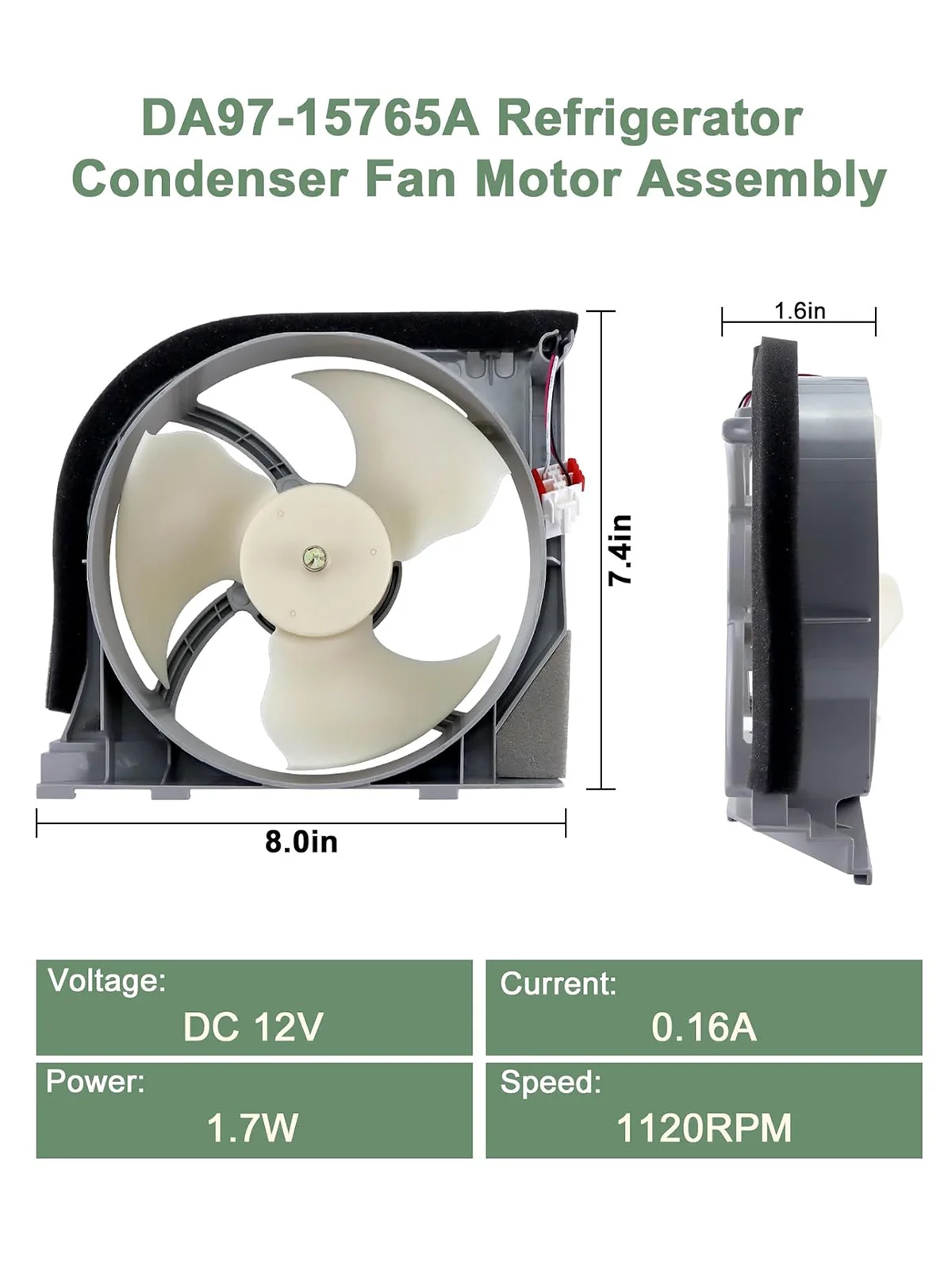 DA97-15765A 모터로 냉장고의 성능을 업그레이드하십시오. 삼성 냉장고 모델 용으로 설계된이 모터는 DC12V 출력을 자랑하며 1120 RPM으로 작동하여 효율적인 냉각 및 최적의 기능을 보장합니다.