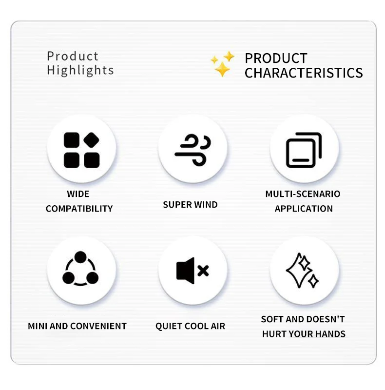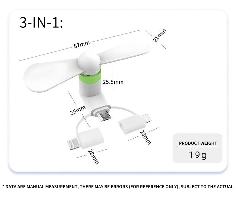 ? 소형 휴대용 디자인:이 소형 휴대용 선풍기는 휴대가 간편하고 이동 중에도 사용할 수 있도록 설계되었습니다. 컴팩트 한 크기로 휴대 전화를위한 편리한 액세서리입니다.