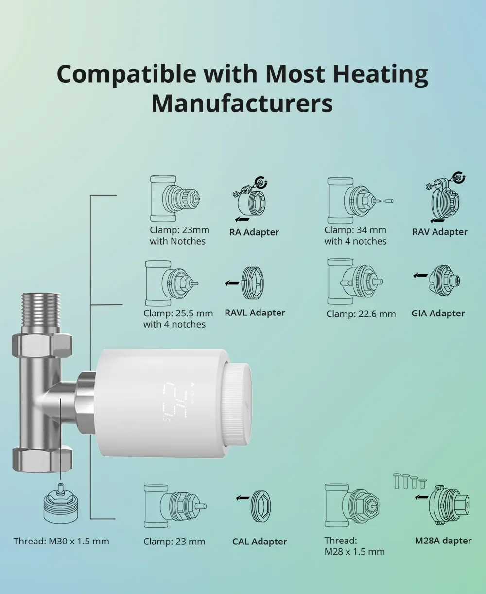 기존의 "M30x1.5mm "라디에이터 밸브에 맞으며 패키지의 밸브 어댑터는 대부분의 난방 시스템 및 제조업체와 호환됩니다.