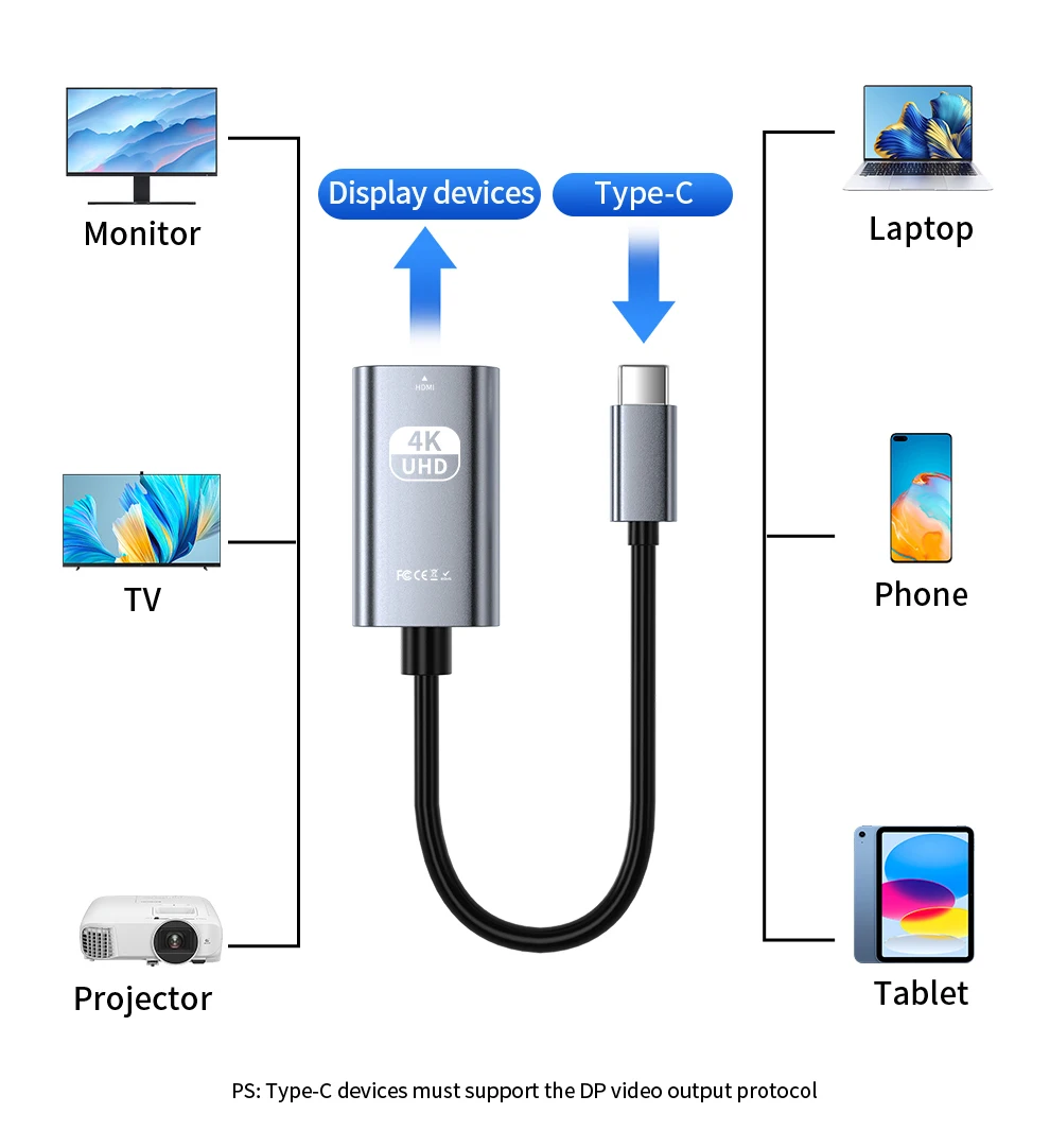 구입하기 전에 type-c 장치가 비디오 출력 기능을 지원하는지 확인하십시오. USB3.1 또는 USB3.2 또는 USB4 또는 Thunderbolt3 또는 Thunderbolt4 비디오 출력을 지원합니다.