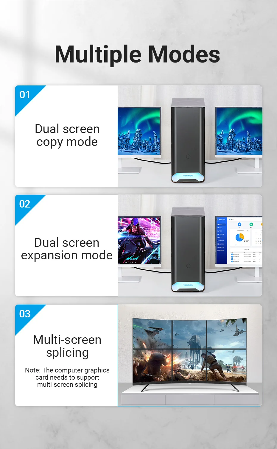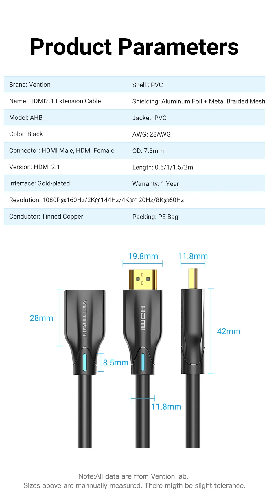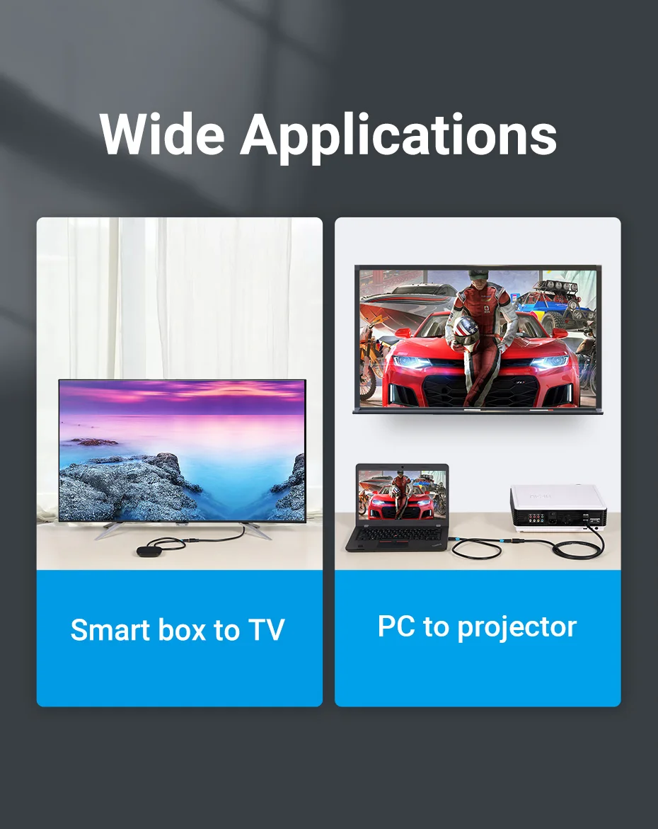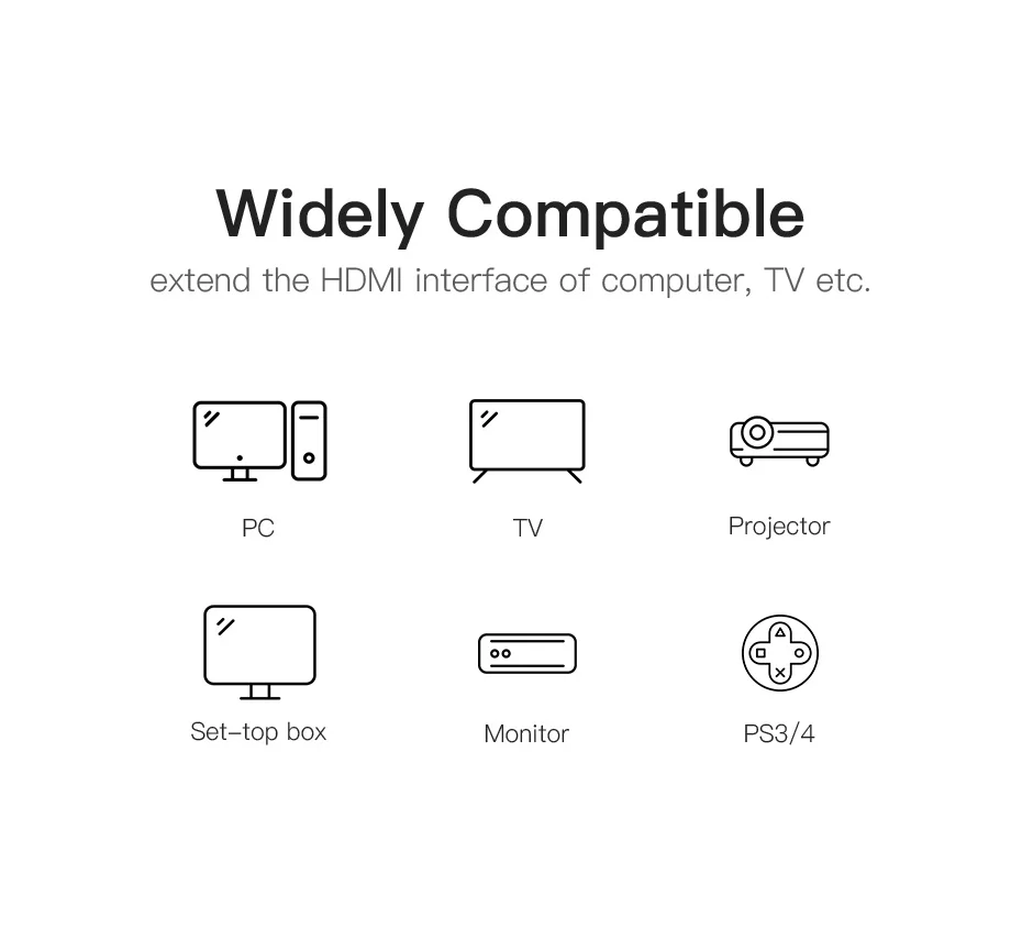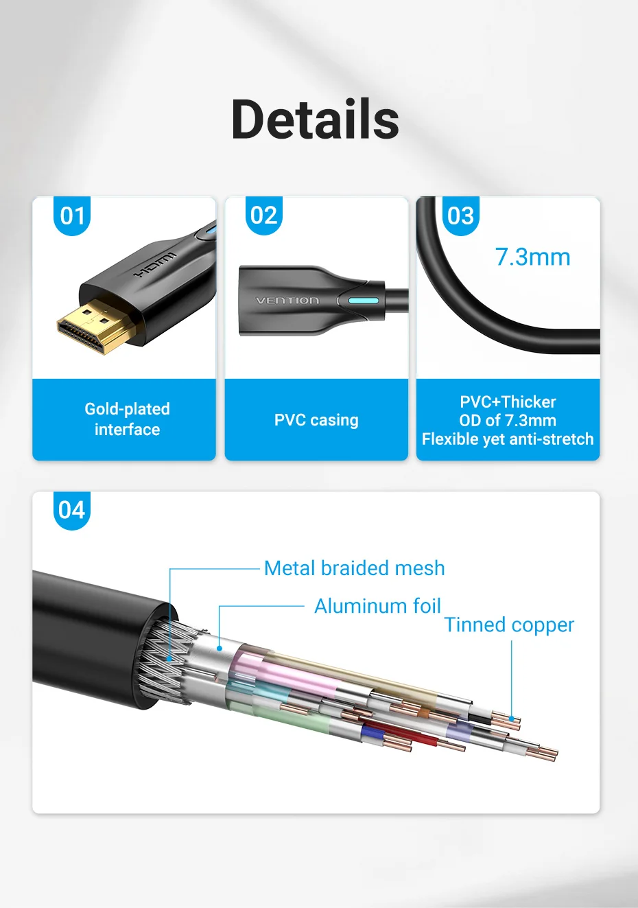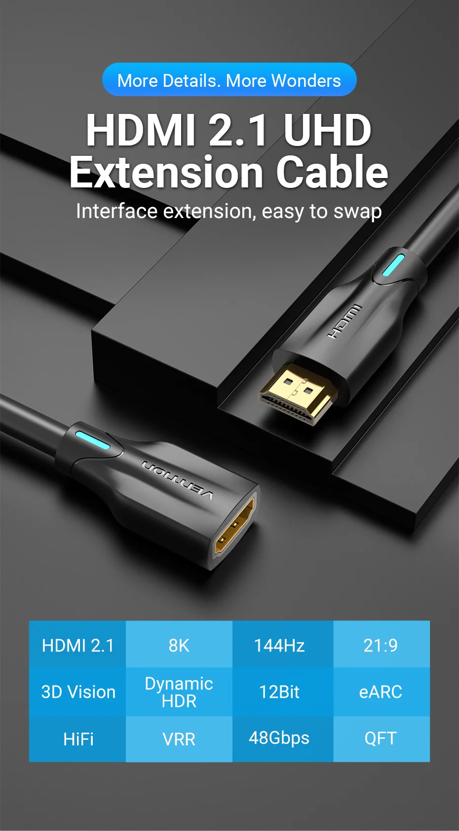 Vention HDMI 연장 케이블은 짧은 HDMI 케이블을 확장하여 모든 표준 HDMI 장치를 연결합니다.