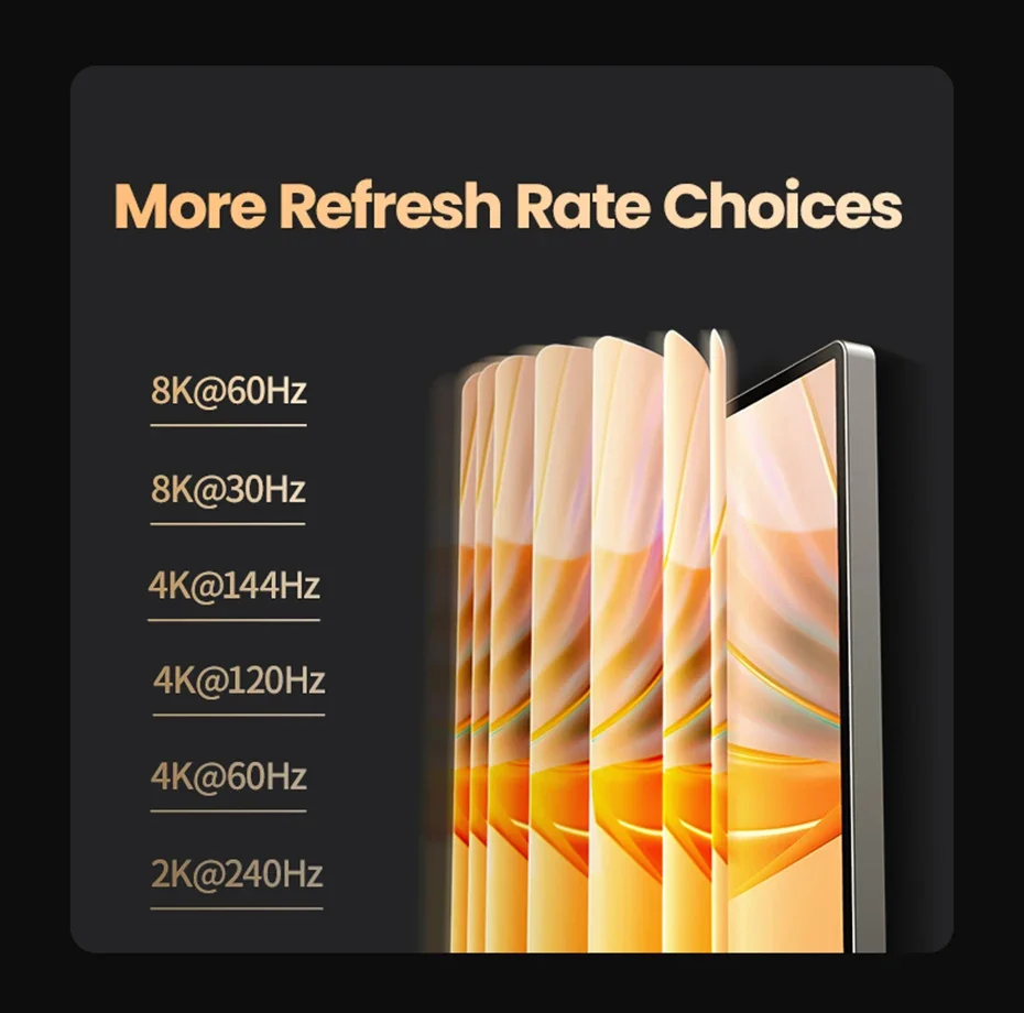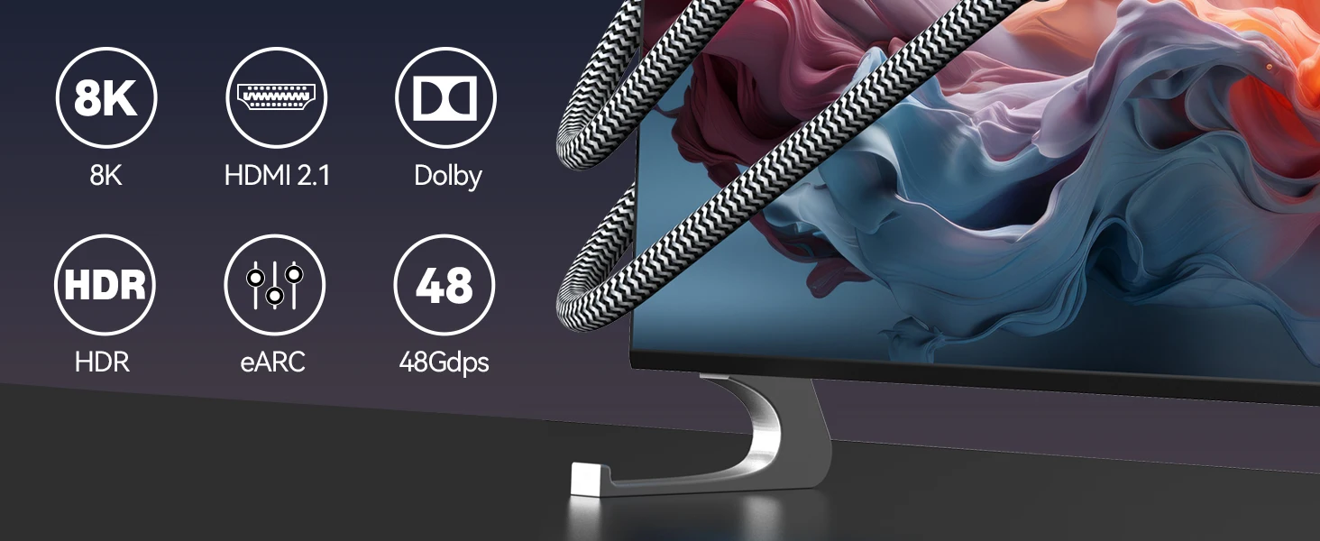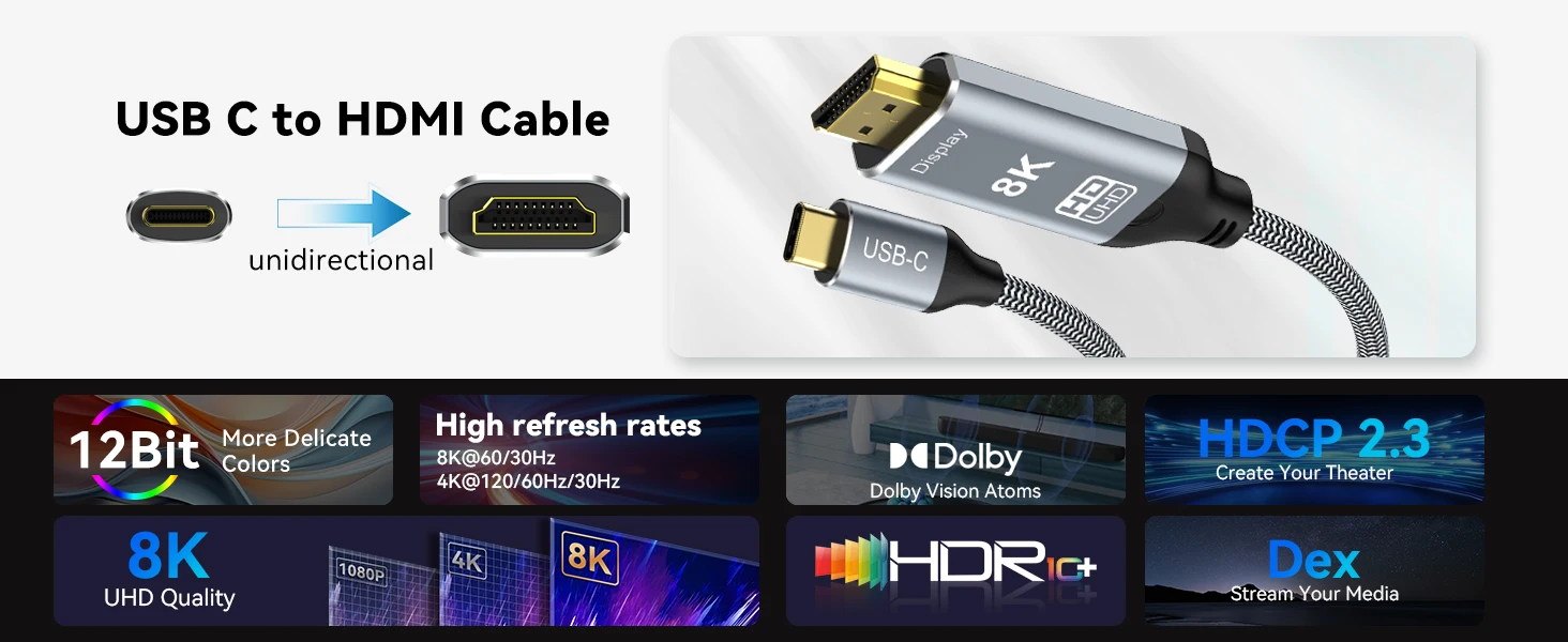 8K USB C to HDMI 2.1 케이블은 최신 HDMI 2.1 표준과 USB-C 다양한 기능을 결합합니다. 8K @ 30Hz, 4K @ 120Hz, 2K @ 144Hz 높은 주사율 및 48Gbps 대역폭을 지원합니다. 거부 화면 지연 및 깜박임. 동적 HDR은 풍부한 색상과 초미세 디테일로 사실적인 시각 효과를 제공합니다. 서라운드 사운드 오디오를위한 eARC 오디오 비주얼 축제를 업그레이드하고 홈 시어터 시스템을 구축하십시오. 플러그 앤 플레이 만하면 추가 드라이버/소프트웨어가 필요하지 않습니다.