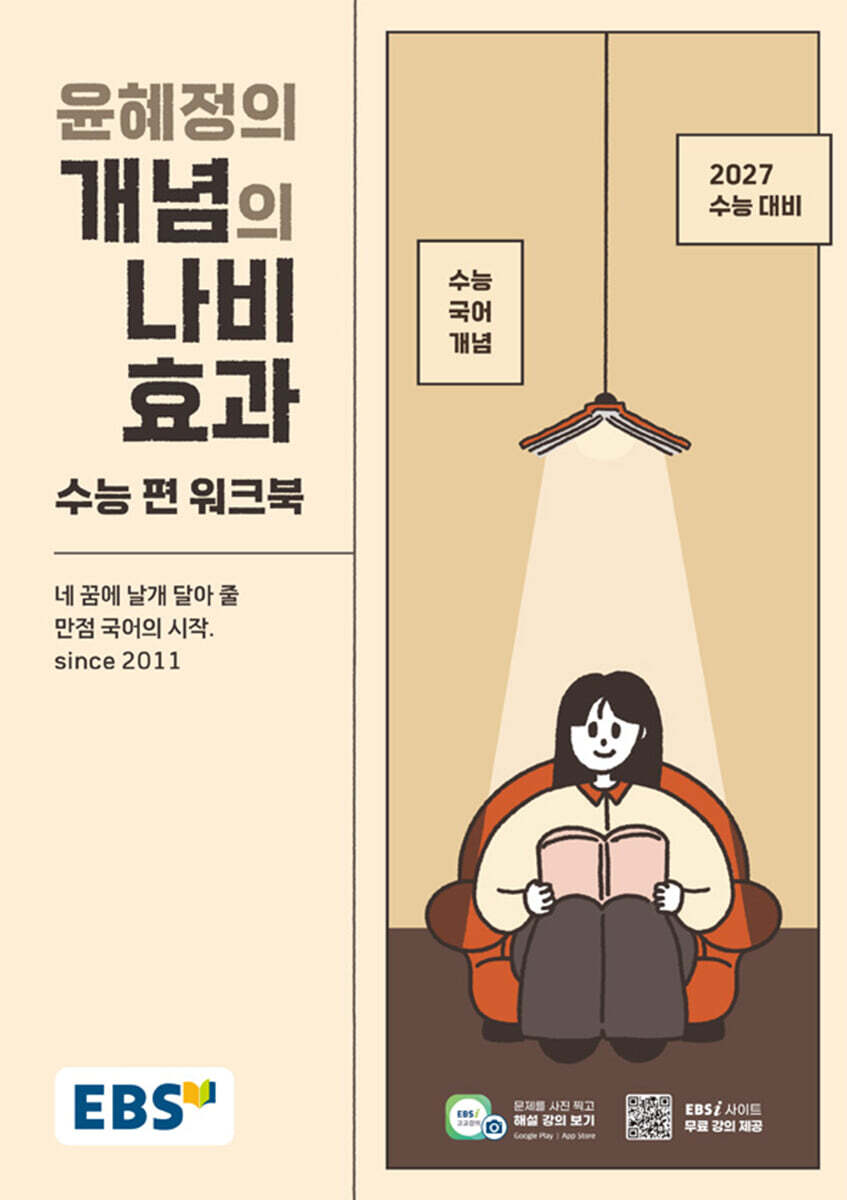 개념의 나비효과 입문 편, 워크북(1권 문학 + 2권 독서·문법) → 개념의 나비효과 수능 편, 워크북 → 패턴의 나비효과 → 수능특강 → 기출의 나비효과 → 수능완성 | | EBS 윤혜정의 개념의 나비효과 수능 편 워크북 (2026년) : 2027 수능대비·수능 국어 개념 <윤혜정> 저 | 한국교육방송공사 | 2025년 10월 내 꿈에 날개 달아 줄 만점 국어의 시작과 끝