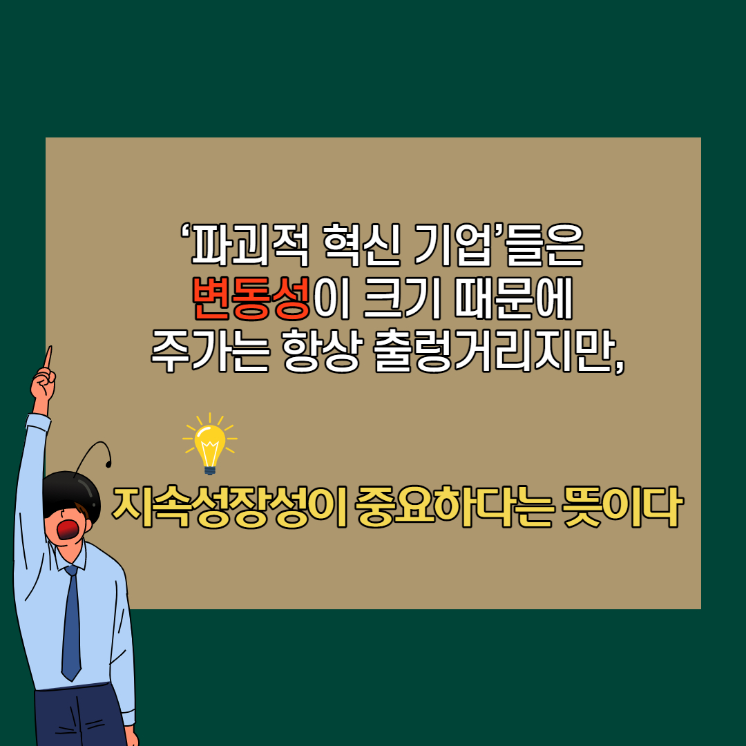 결국은 성장의 힘을 믿어야 한다. 성장이 가장 큰 안전 마진이다. 높은 성장률은 홀딩할 수 있는 가장 큰 힘이 된다. 이러한 기업들은 변동성이 크기 때문에 주가는 항상 출렁거리지만 지속적으로 성장하고 있다는 것 자체가 장기적으로 올바른 방향으로 가고 있다는 것을 의미한다. PER, PBR 등 숫자에 매몰되기보다는 혁신의 방향이 어디로 가고 있는지 확인하는 것이 중요하다. 그러면 뉴스에 일희일비하지 않게 된다.
