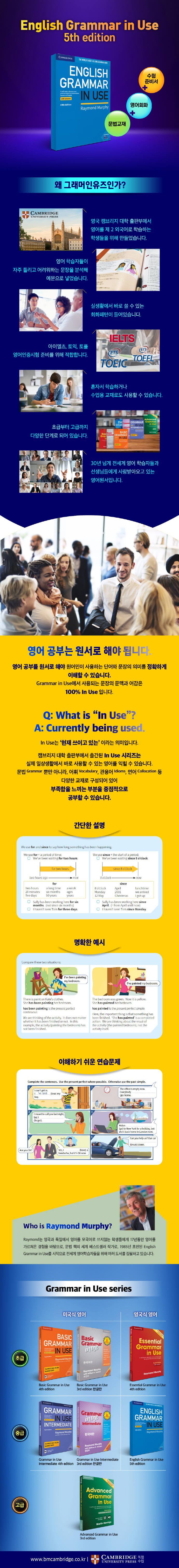 English Grammar in Use 는 중급 학습자들이 자가 학습 및 수업시간에 활용할 수 있는 교재입니다. 명료한 설명과 충분한 연습문제들을 통해 중,고급 학습자들은 자신의 수준에 필요한 모든 문법 영역을 학습할 수 있습니다.