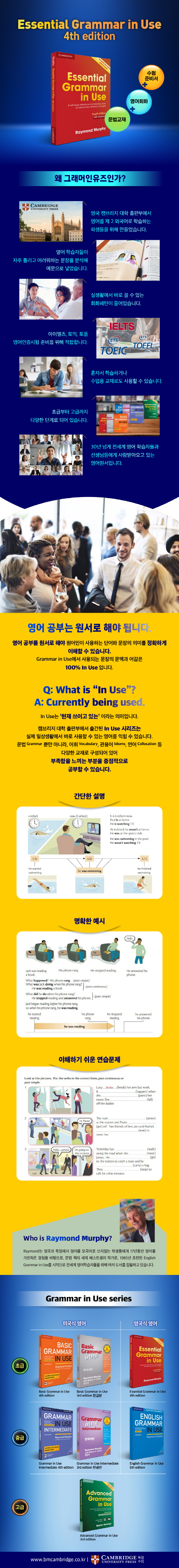 Essential Grammar in Use는 초급학습자들이 자가학습 및 수업시간에 활용 할 수 있는 베스트셀러 문법책입니다. 명확한 예문들과 연습문제들이 수록된 이 문법책을 통해 초급학습자들은 자신의 수준에 필요한 모든 문법영역을 학습할 수 있습니다.
