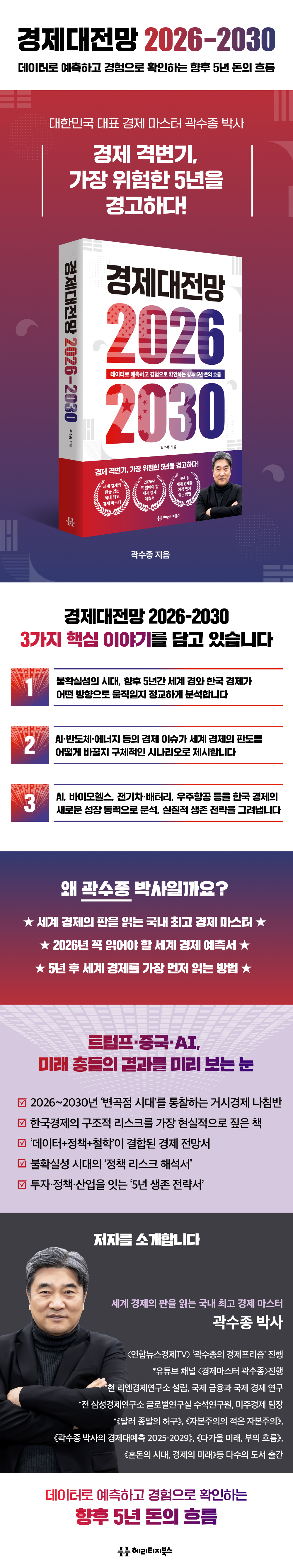 곽수종 박사는 “예측은 정답이 아니라 방향”이라고 말한다. 경제의 방향을 읽는 자만이 위기 속에서도 기회를 잡을 수 있다는 것이다. 수많은 단기 뉴스와 변동성에 흔들리기 쉬운 지금, 경제대전망 2026-2030》은 장기적인 시야와 구조적 통찰로 독자에게 냉정한 판단의 근거를 제공한다. 변화의 5년, 새로운 경제의 질서를 준비해야 할 모든 사람에게 이 책은 하나의 ‘나침반’이 될 것이다.