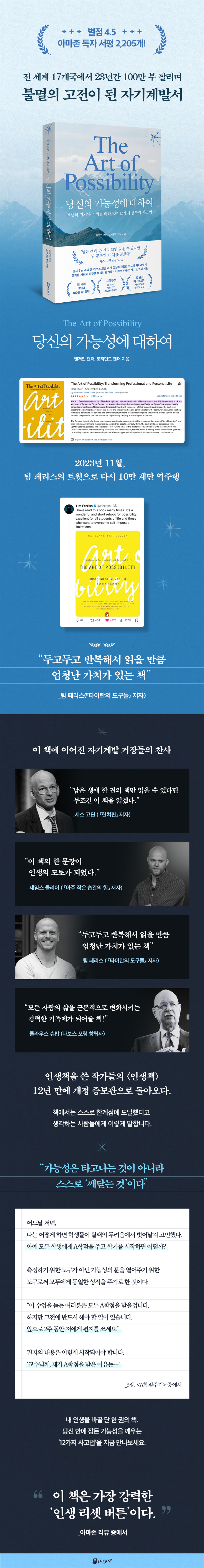 팀 페리스, 세스 고딘, 제임스 클리어…… 자기계발 분야에서 거장이라 불리는 작가들이 있다. 이 거장들이 입을 모아 추천하고 경전처럼 반복해 읽는 책이 있다. 바로 벤저민 젠더와 로저먼드 잰더의 『당신의 가능성에 대하여』다.