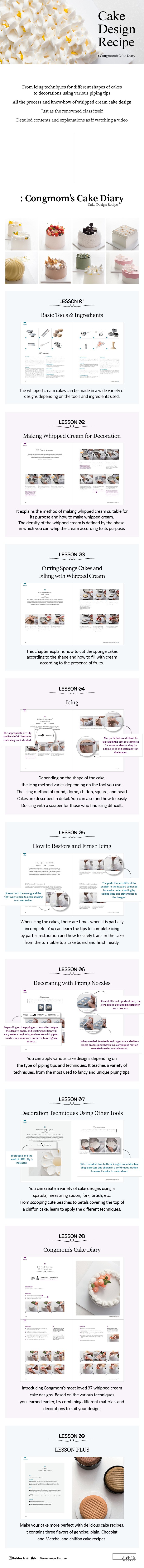 Congmom’s most popular 33 cake designs are also included, along with design tips and pictures of each process in detail. By combining the techniques introduced in earlier chapters and various decorations, you can master the overall skills and apply them in your own way. It also includes four other applied designs and delicious genoise and chiffon recipes.