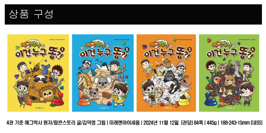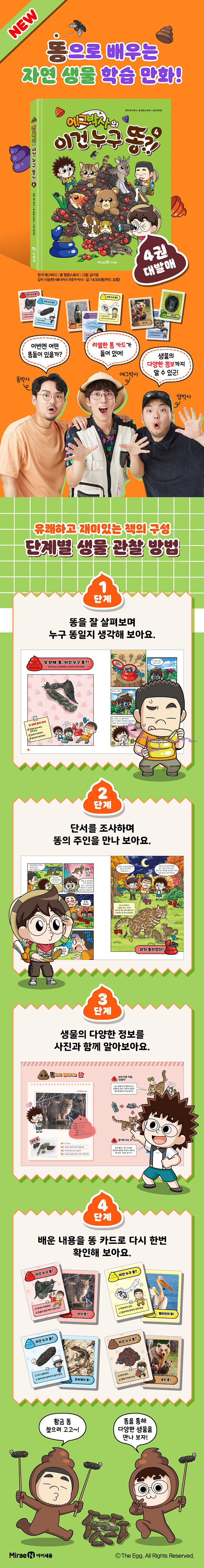 여러분들은 ‘똥’에 대해 깊이 생각해 본 적이 있나요? 똥은 그저 구릿한 냄새가 나는 더러운 존재일까요? 사실 똥에는 생물에 대한 많은 정보가 담겨 있습니다. 똥을 관찰하면 그 생물이 주로 무엇을 먹고 살며, 어디에 사는지 알 수 있어요. 또 생물의 똥은 때때로 사람에게 도움이 되기도 해요. 사막에서는 말린 똥을 땔감으로 활용하고, 심지어는 피부 미용 재료나 약으로 쓰이는 똥도 있답니다. 『에그박사의 이건 누구 똥?!』은 자연·생물 콘텐츠 인기 키즈 크리에이터, ‘에그박사’와 함께 ‘똥’을 통해 자연 생물들의 생태와 다양한 정보를 배울 수 있는 학습 만화 시리즈입니다. 생생한 만화를 읽으며 똥을 요리조리 관찰해 보고, 그 똥이 누구의 똥일지 단서를 따라 조사해 보세요. 그리고 똥 카드를 활용해 배운 내용을 다시 한번 즐겁게 떠올려 보세요. 자, 그럼 에그박사, 웅박사, 양박사와 함께 해안가에서 찾은 황금 똥에서 튀어나온 똥들의 주인을 찾으러 떠나 볼까요?