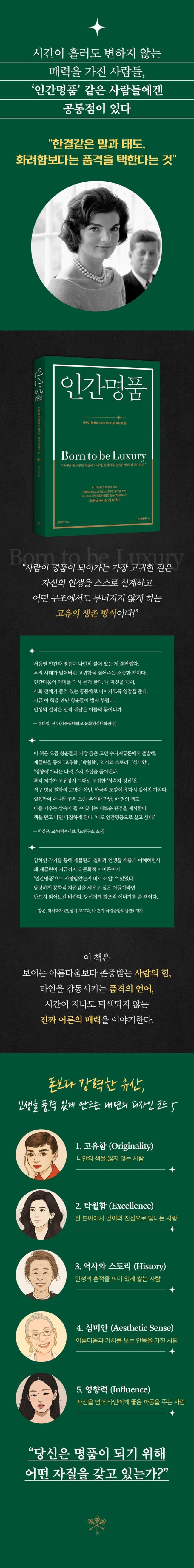 『인간명품』이 제시하는 해답은 문화적 자부심이다. 저자가 고유명사 그대로 고집한 상속자 정신(Sangsokja Jungshin)은 한국적 맥락에서 재해석된 과거로부터 물려받는 힘이다. 조선 백자, 유럽의 아틀리에, 장인의 노력 속에서 축적된 가치가 오늘의 청춘을 다시, 스스로 빛나는 명품으로 태어나게 한다.