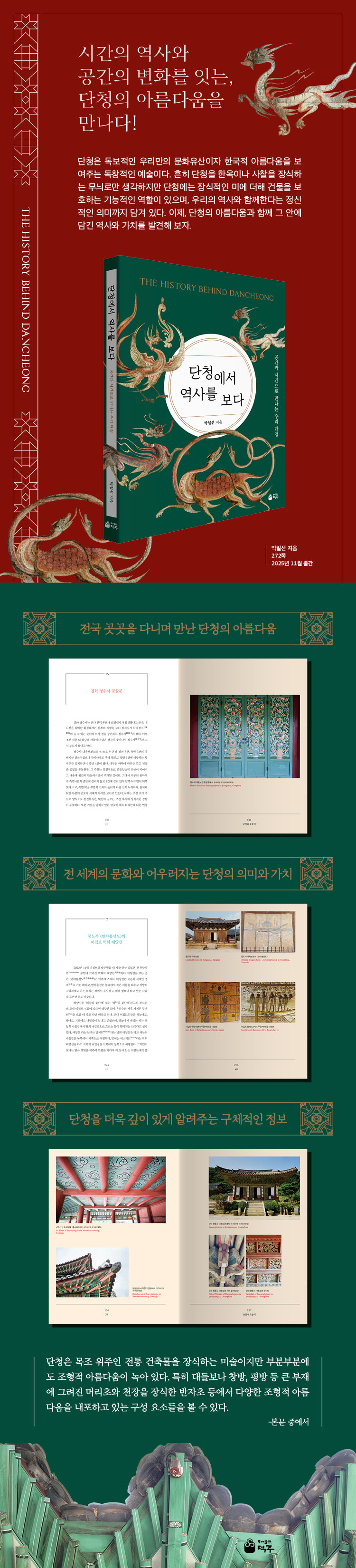『단청에서 역사를 보다』는 단순히 단청을 소개하는 책이 아니다. 우리와 시간을 함께해 온 단청이 어떻게 변해왔는지, 그 변화가 어떤 이야기를 만들었는지 보여주는 단청 연대표와 같다. 대한성공회 강화성당은 한옥 성당으로 태극문양을 사용해 자연스럽게 우리 문화를 담아냈고, 서울 흥천사의 꽃살문에는 다산을 상징하는 포도를 조각해 붙였고, 남한산성 수어장대는 방어를 목적으로 만들었으며 나라의 안정과 평화를 기원하는 태평화를 그려 넣었다. 이렇듯 단청은 우리의 바람을 담아 시대를 반영해 왔다. 그리고 이런 변화에 단청의 정수가 담겨 있다. 사람들과 더불어 흐르는 예술이 단청인 것이다. 단청 안에 담긴 이야기와 시간, 그 역사를 톺아보며 단청의 세계를 확장하고 그 가치를 감상해 보자.