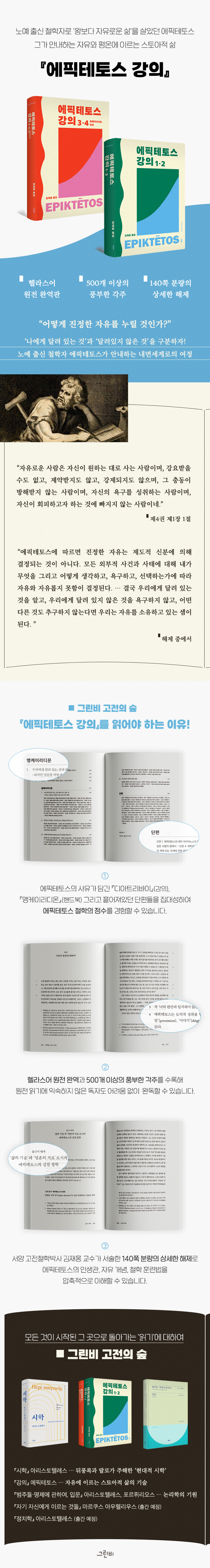 에픽테토스의 『강의』는 니코폴리스에서 가르침을 전하던 에픽테토스의 열렬한 수강생, 아리아노스가 기록한 것으로 총 8권이었으나 현재는 4권만이 전해진다. 이에 그린비출판사에서는 곧 『에픽테토스 강의 3·4, 엥케이리디온, 단편』을 출간함으로써 『강의』 4권을 모두 소개할 예정이다. 『강의』는 당시 민중들 사이에서 보편적으로 쓰였던 언어이자 신약성서 헬라스어인 코이네로 기록되어 있으며, 초기 기독교 철학자인 오리게네스의 보고에 따르면 단지 문헌학자들에게서만 주로 읽혔던 플라톤보다 에픽테토스의 책이 더 대중적인 인기를 누렸다고도 한다. 그린비 고전의 숲 2번으로 출간되는 『에픽테토스 강의 1·2』는 기록이 남아 있는 4권 중 1, 2권을 원문 형태를 살려 번역 출간하는 것으로서, 그의 ‘대화식’ 가르침을 생생하게 전해들을 수 있다.