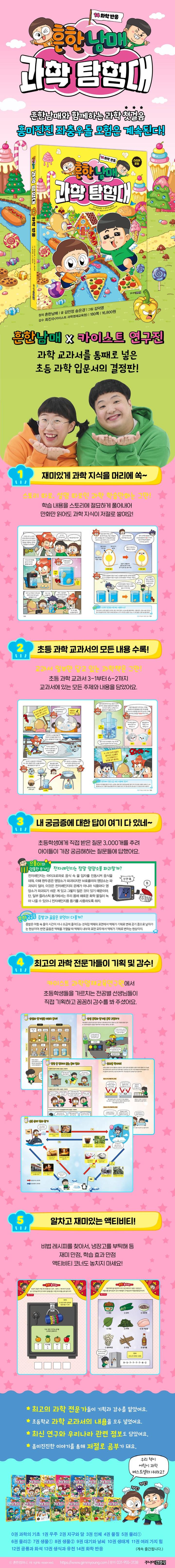 스토리 따로, 학습 내용 따로인 과학 학습만화는 이제 그만! 그동안 과학 학습만화는 스토리와 학습 내용이 물과 기름처럼 섞여 아이들이 만화 스토리만 읽고 넘어가는 경우가 많았습니다. 《흔한남매 과학 탐험대》는 학습 정보를 스토리에 절묘하게 녹여 내어, 만화만 봐도 학습 내용이 저절로 기억날 수 있도록 구성하였습니다. 이제 즐겁게 만화를 읽으며 나도 모르게 과학 지식을 차곡차곡 쌓아 가세요!