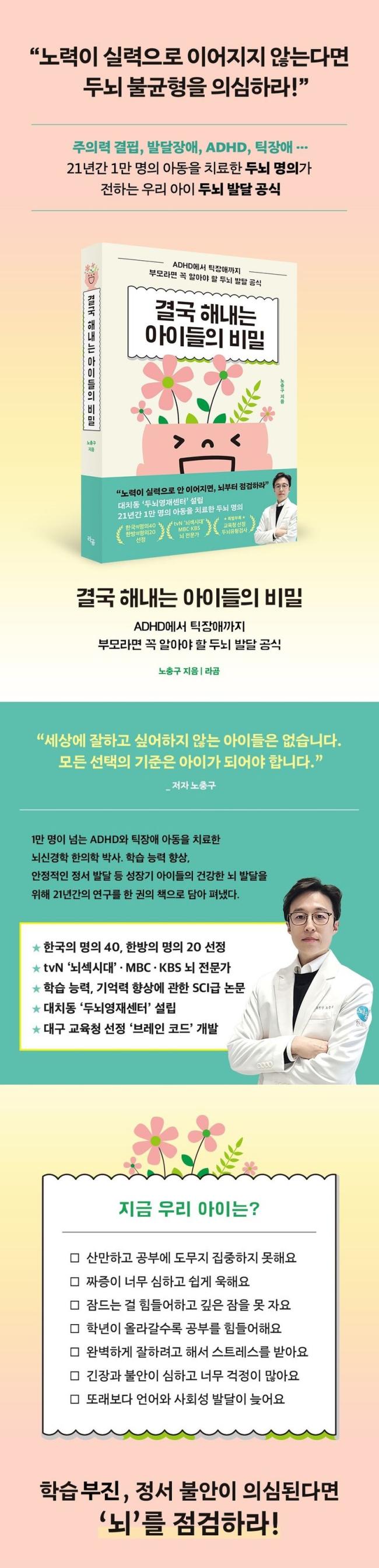 대치동에서 두뇌영재센터를 운영하며, 두뇌 검사로 아이들의 적성을 찾아주는브레인코드로 입소문 난 뇌움한의원 노충구 원장. 21년간 1만 명이 넘는 환자를 치료하고, 학습 부진과 정서 불안 등 아동클리닉 부문에서 한국의 명의 40·한방의 명의 20에 선정된 뇌신경학 한의학 박사인 그가 『결국 해내는 아이들의 비밀』을 통해 아이들의 균형 잡힌 뇌 발달을 위해 부모들이 꼭 알아야 할 조언을 담아 펴냈다.