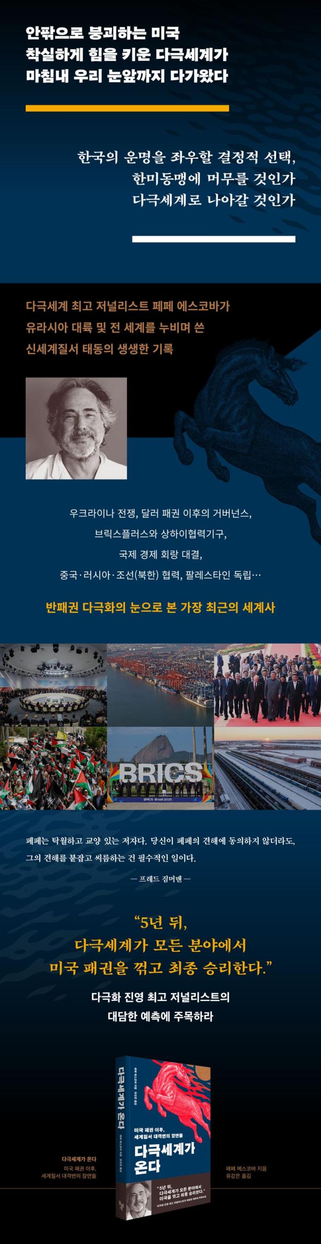 미국을 중심으로 구성된 세상을 기본값으로 하는 관성적인 우리의 관점과는 매우 다른 방식으로 세계 역사의 중심축이 차곡차곡 만들어지는 지금, 숨 가쁘게 이어지는 국제질서의 대변동 속에서 핵심적 흐름과 대세를 이해하고 미래를 예측하고 싶다면, 동의 여부를 떠나 페페 에스코바의 대담하고 급진적인 이야기에 귀 기울일 필요가 있다. 이미 다극세계는 우리의 인식보다 더 빠른 속도로 현실에 뿌리내리고 있기 때문이다. 미국과 집단서방의 예외주의라는 눈가리개를 이제는 벗어던지자는 저자의 외침은, 오늘의 한국 사회에서 중요한 의의를 지닌다.