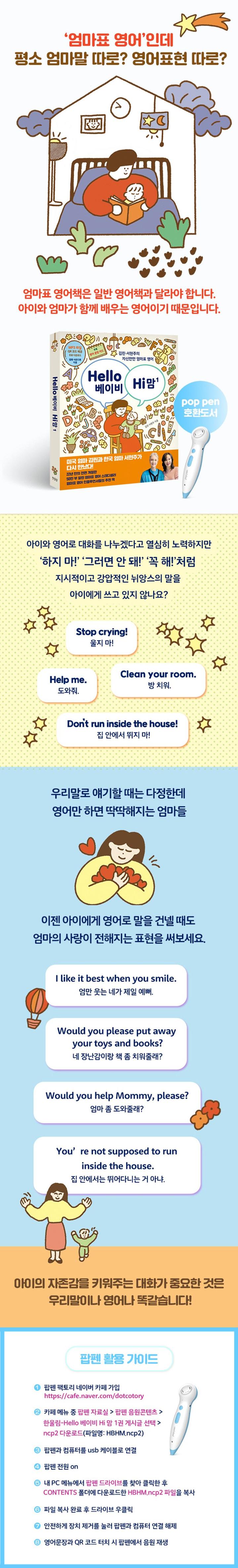 말 못 하는 아기에게 영어는커녕 한국어로도 말 걸기 어색한 분이라면, 이 책에 나온 표현을 연습해서 아기에게 자꾸 말을 걸어 보세요. 어느새 세상 따뜻한 엄마가 되어 있는 자신을 발견하게 됩니다. 아이 마음을 헤아리는 엄마표 영어 회화책은 《Hello 베이비 Hi 맘》이 전무후무합니다. 엄마표 영어는 이 책으로 시작하세요.