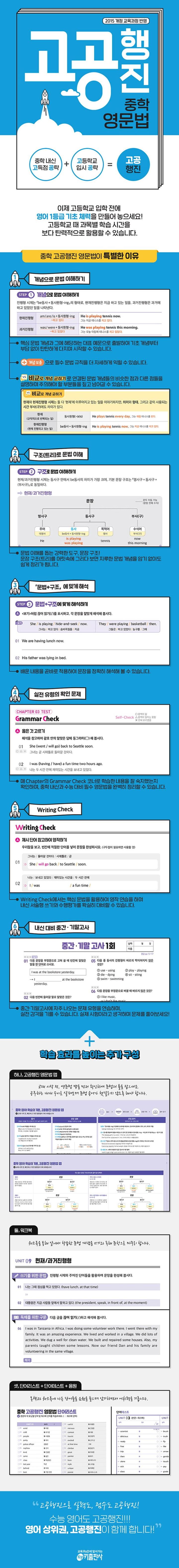 〈중학 고공행진 영문법〉은 중학 문법 개념을 완성하고, 내신 객관식 문항은 물론 서술형 쓰기와 수행평가까지 완벽하게 대비할 수 있는 교재이다.