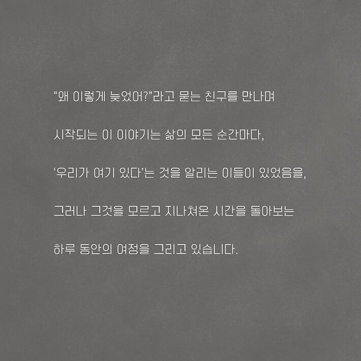 나는 어디에 있고, 어디로 가고 있는 것일까? 오직 나에 대한 물음만을 끌어안고 여기까지 왔음에도, 지금 서 있는 곳이 어디인지 여전히 알 수 없어 눈앞이 캄캄하던 어느 날의 꿈속을 그린 이야기입니다. 부디 오해와 상처로 남는 책이 아니기를 바라며… 부끄러웠던 내 이름을 다시 불러 주기를.