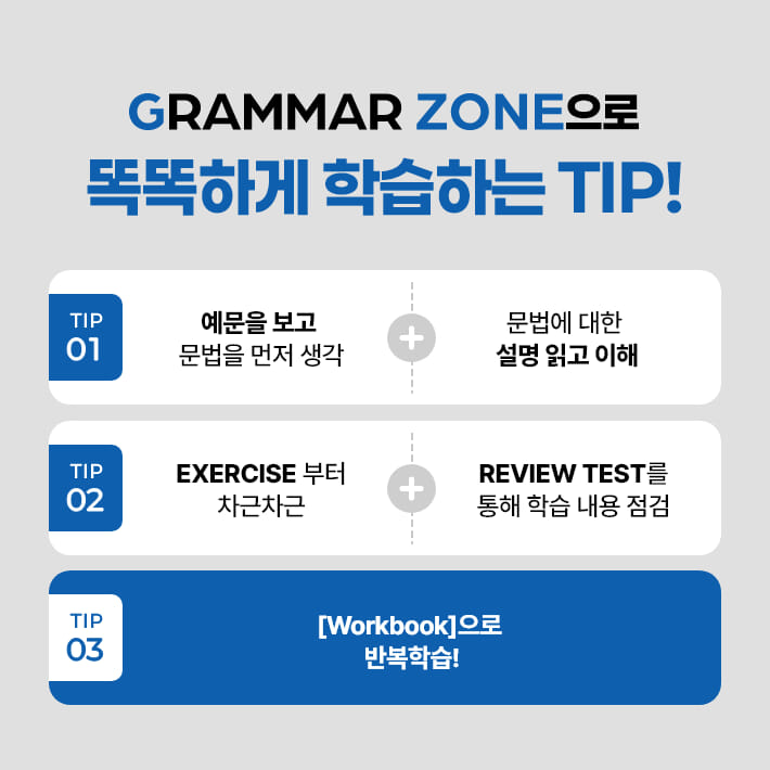 왜 예문이 문법 설명보다 먼저 제시되어 있을까요? 맥락이 있는 예문을 통해 학습자는 문법 규칙을 스스로 찾아낼 수 있어 이해도 잘 되고 기억에도 오래 남습니다. 문법 설명이 먼저 제시되어 있으면, 학습자는 수동적으로 문법 규칙을 암기하려고 합니다. 즉, 예문을 보고 어떤 규칙이 있는지 생각해 본 후, 옆의 설명을 읽으면 『Grammar Zone』의 학습 효과를 극대화할 수 있습니다. 복습할 때는 설명을 먼저 읽어도 좋고, 설명만 한 번 더 읽으며 개념을 정리할 수도 있습니다.