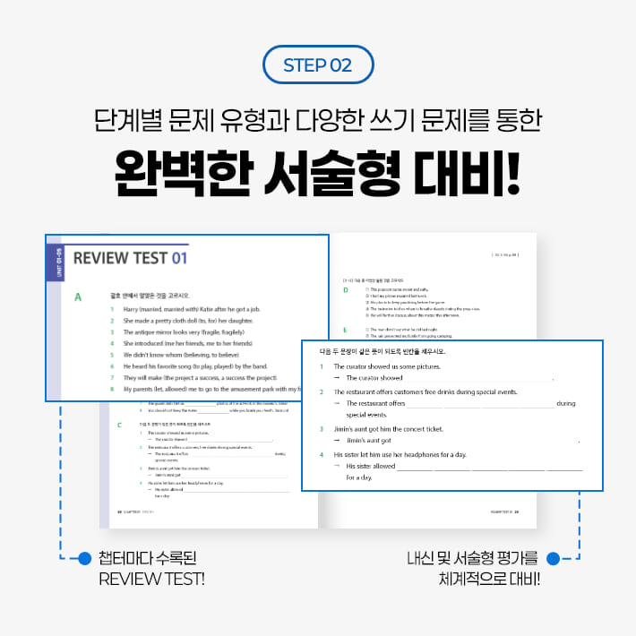 문법 개념을 이해했다면 이제 직접 적용해 보는 단계입니다. EXERCISE의 간단한 문제부터 차근차근 풀어보세요. 틀린 문제는 다시 본문으로 돌아가 해당 문법 규칙을 재확인하는 것이 중요합니다. REVIEW TEST에서는 다양한 유형의 문제를 통해 학습한 내용을 종합적으로 점검할 수 있습니다. 특히 지문형 문제를 풀 때는 단순히 정답을 찾는 것보다 배운 문법이 실제 독해 지문에 서 어떻게 사용되는지 관찰하며 해석해 보세요. 이를 통해 문법 지식과 독해력을 동시에 향상시킬 수 있습니다.