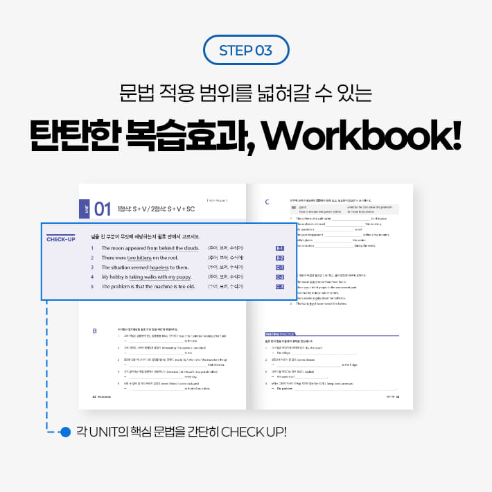 본책에서 문법 개념과 기본기를 익혔다면, 워크북을 활용해 반복 학습하며 문법을 자동으로 인식할 수 있도록 연습하세요. 본책과는 다른 맥락의 문장들을 접하면서 문법 적용 범위를 넓혀가는 것이 핵심입니다. 개념 확인 문제로 기본기를 점검하고, 응용 문제와 서술형 문제를 통해 실전 감각을 기르세요. 특히 부족한 부분이 있다면 해당 챕터의 본책 내용을 다시 한번 숙지하고 워크북 문제를 집중적으로 풀어 체계적으로 보완할 수 있습니다.