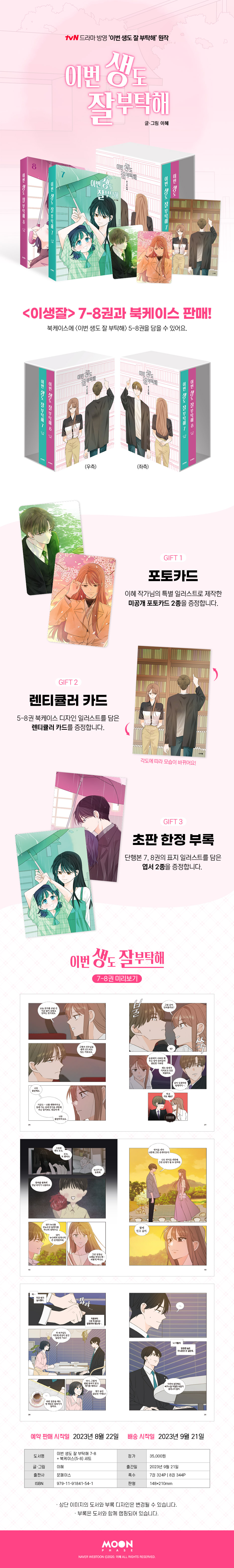 서서히 밝혀지는 23년 전 사고의 진실과 범인. 그리고 '서하'에게 털어놓는 '지음'의 비밀까지! 2023년 화제의 드라마 tvN '이번 생도 잘 부탁해'의 원작 웹툰 단행본 7~8권에서 만날 수 있는 이야기!