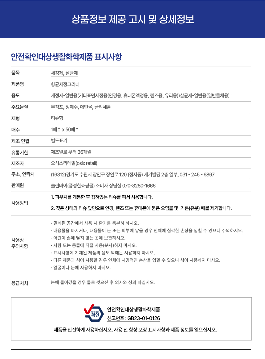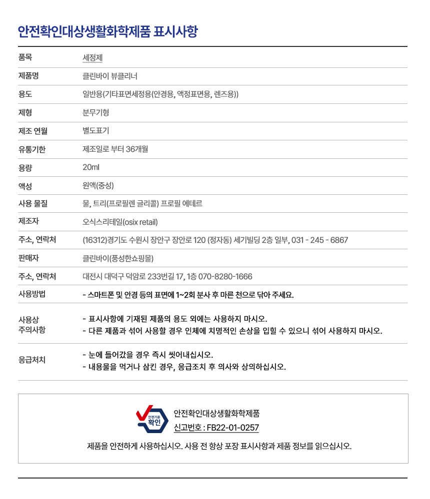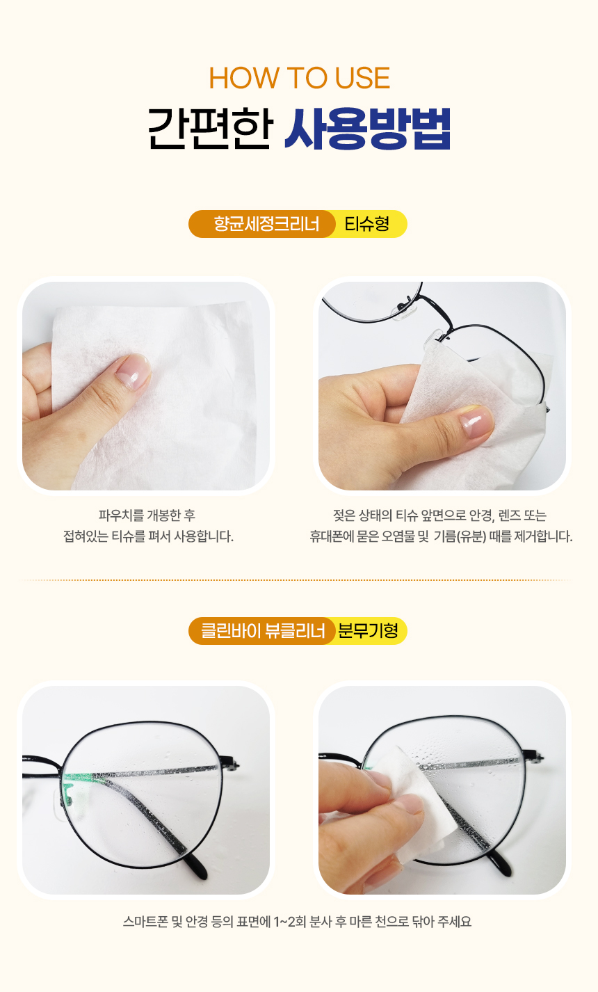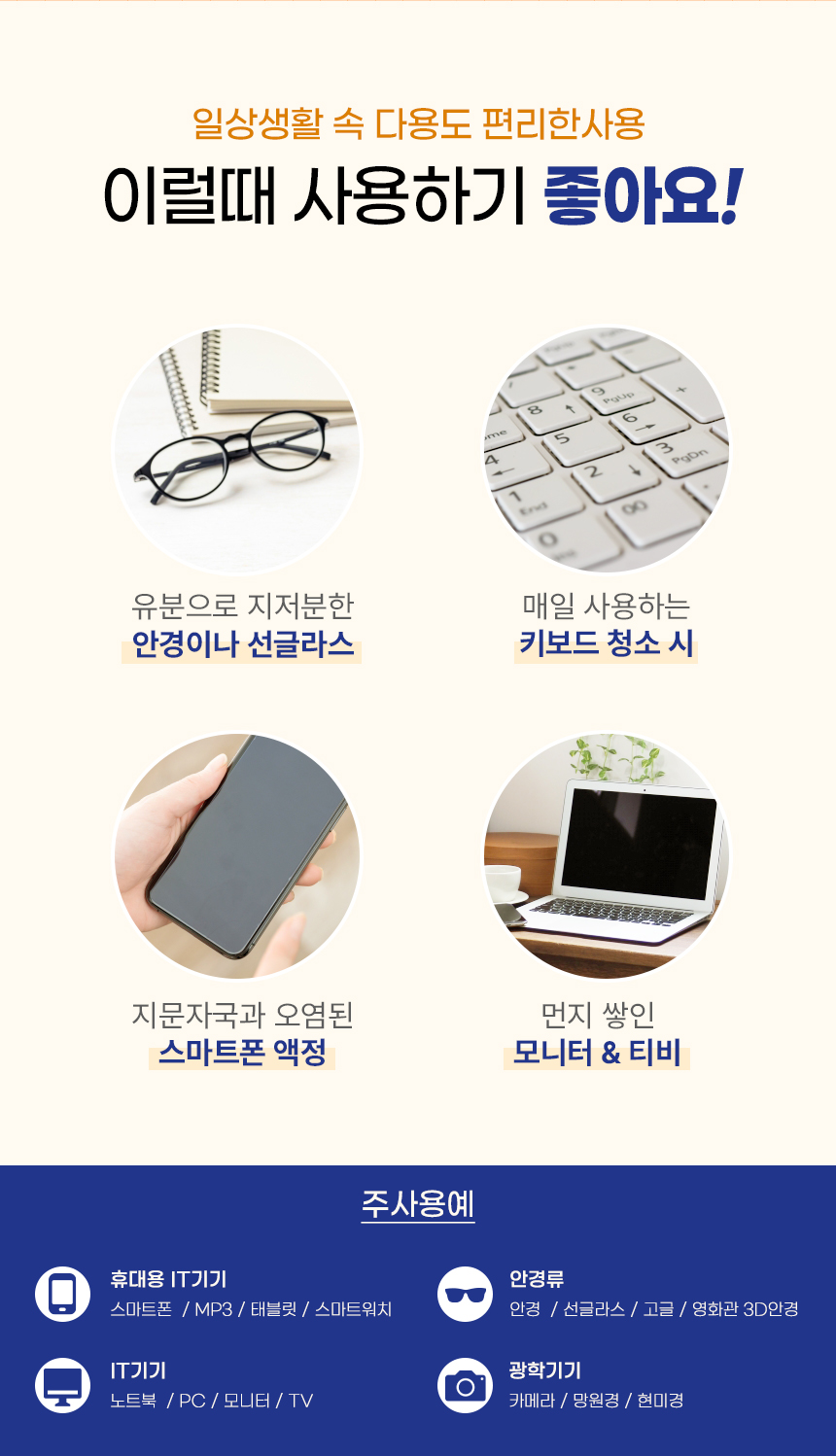 휴대폰이나 안경 및 선글라스, PC, 모니터, 고글, 키보드 등에 간편히 액정세척 및 소독용 안경닦이로 사용할 수 있으며,