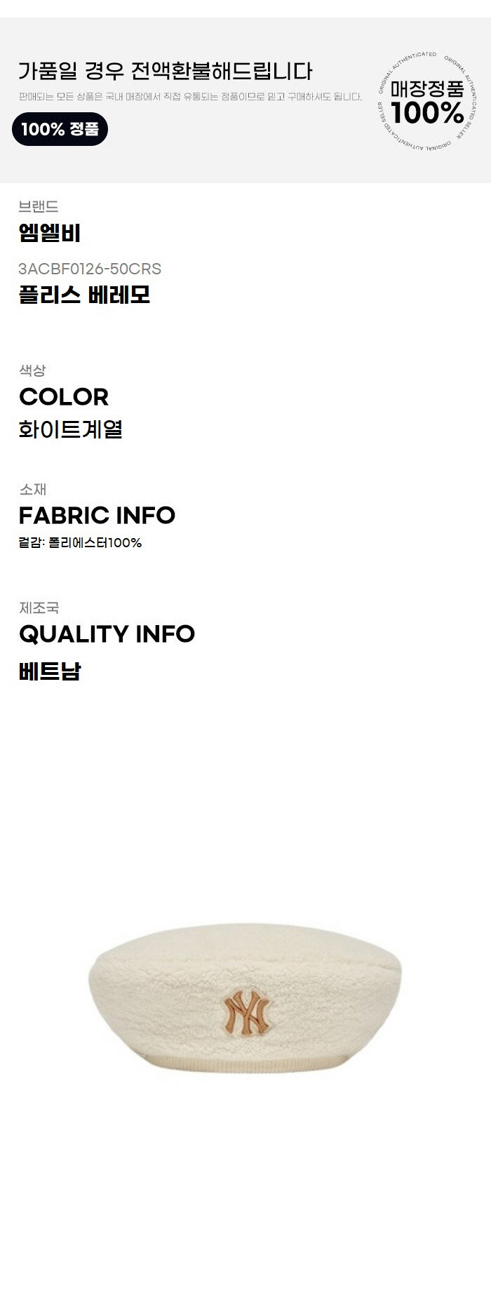 MLB 모자 PQJ 3ACBF0126-50CRS 플리스 베레모