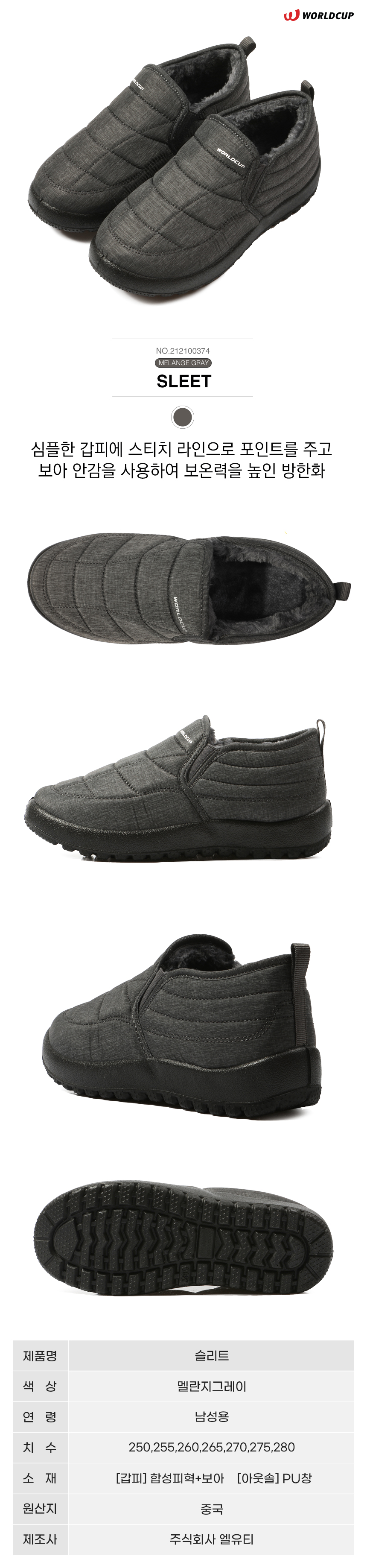 (무료배송) 남성 겨울 방한화 안감털 운동화 그레이 (슬리트) 250-280mm