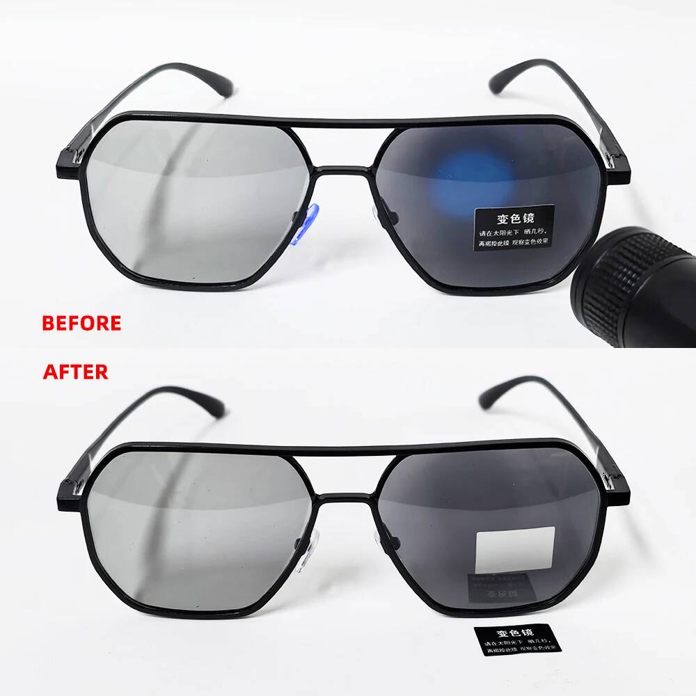 선글라스를 받으면 렌즈에 광변색 테스트 검정색 라벨이 있습니다.강한 햇빛 아래에 두고 30~60초 후에 검은색 라벨을 제거하면 렌즈의 변화를 볼 수 있습니다.자외선이 강할수록 렌즈 색상이 어두워집니다.