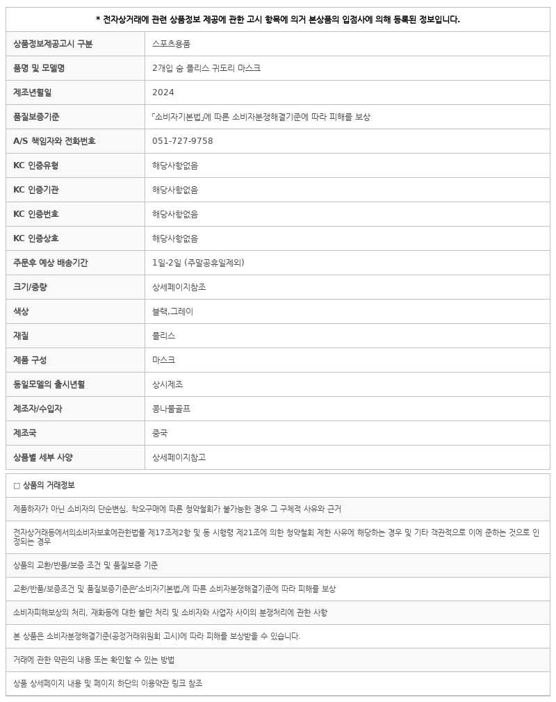 KN484 1+1숨 귀도리 마스크 방한 겨울 스포츠 플리스 귀마개마스크 (23500639)