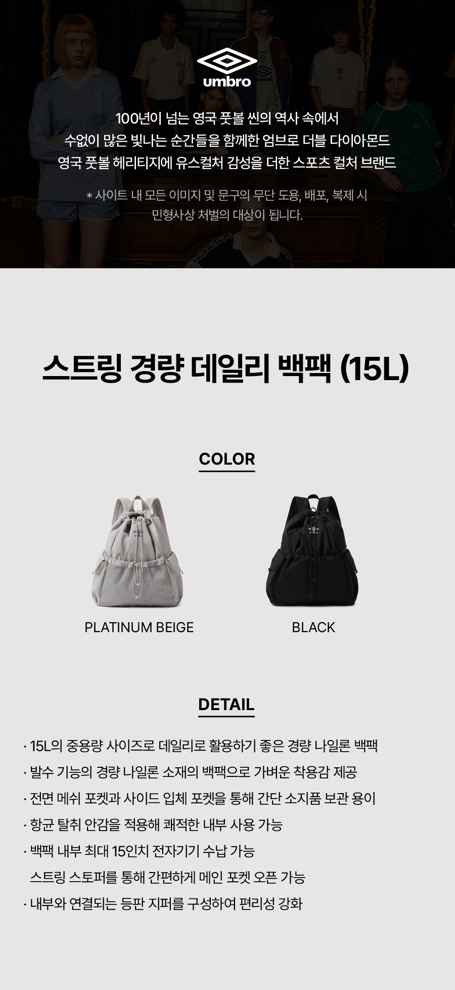 엄브로(백) 엄브로 스트링 경량 데일리 백팩 (15L) UR123CBP24 2종