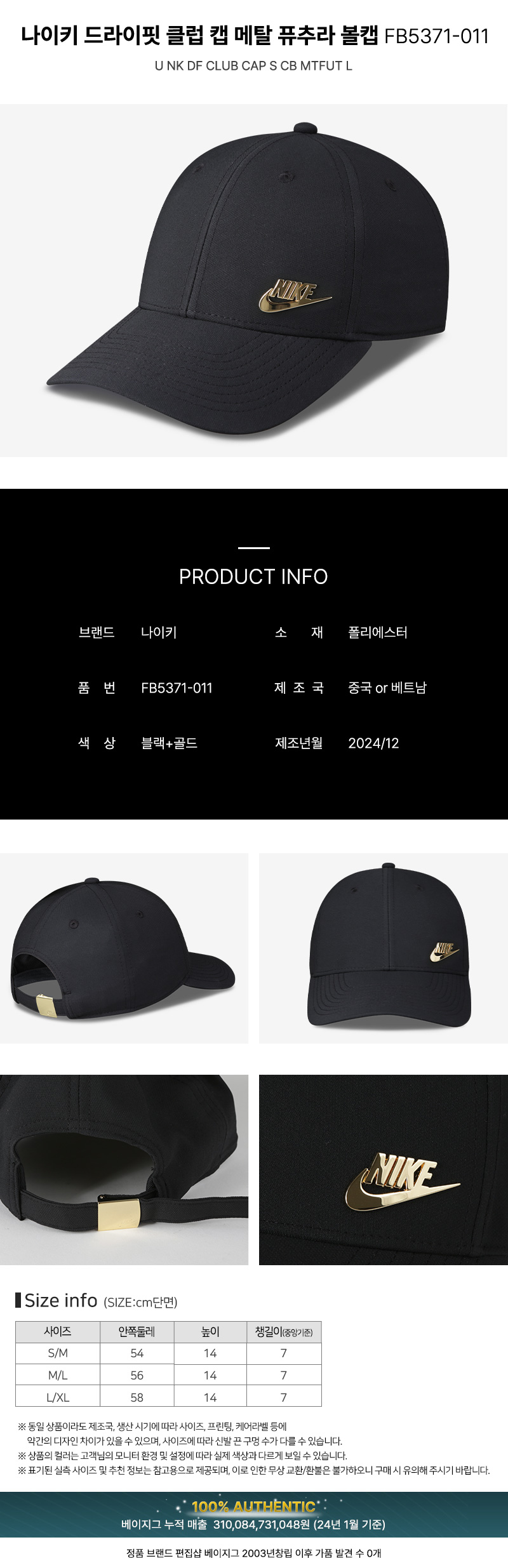 나이키 드라이핏 클럽 메탈 퓨추라 야구 여행 볼캡 모자 FB5371-011