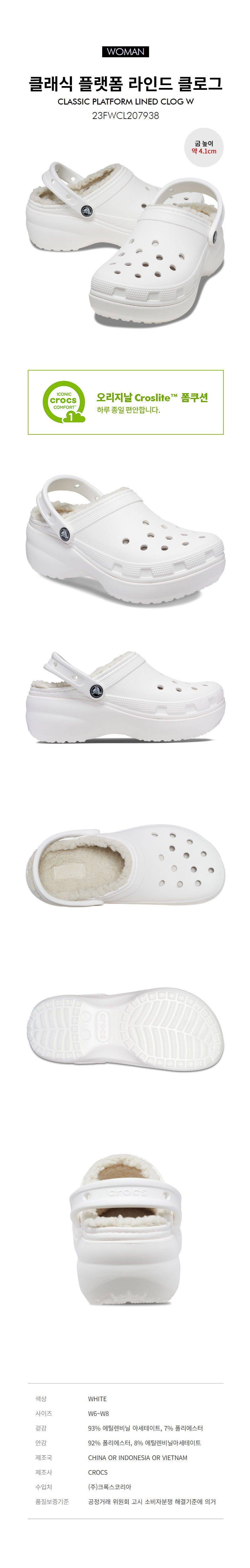 여성 클래식 플랫폼 라인드 클로그 W WHITE (23FWCL207938)