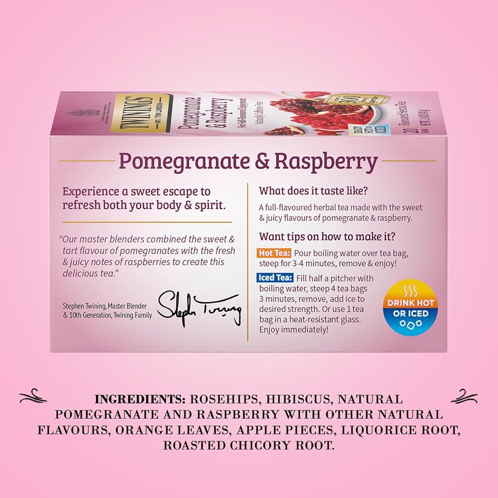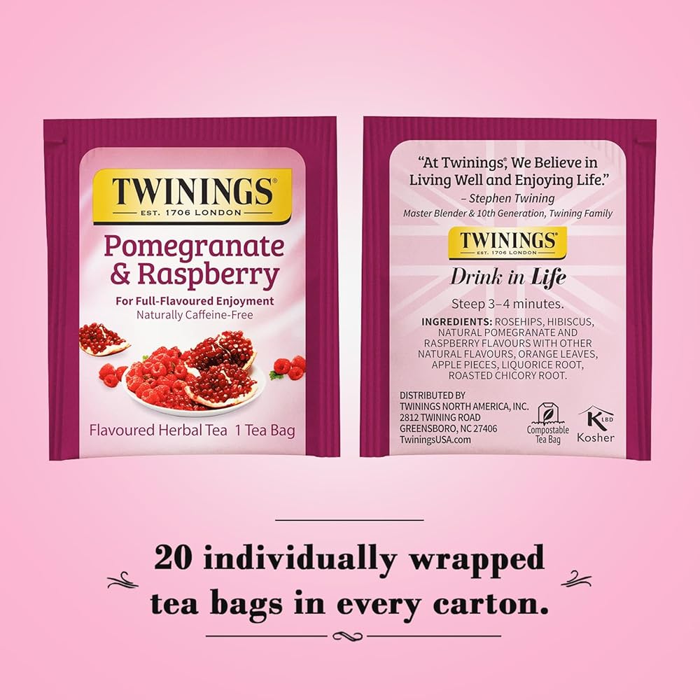 트윈링 석류 라즈베리 티 - 카페인이 없는 천연 허브 티백 개별 포장 20 카운트(2팩)