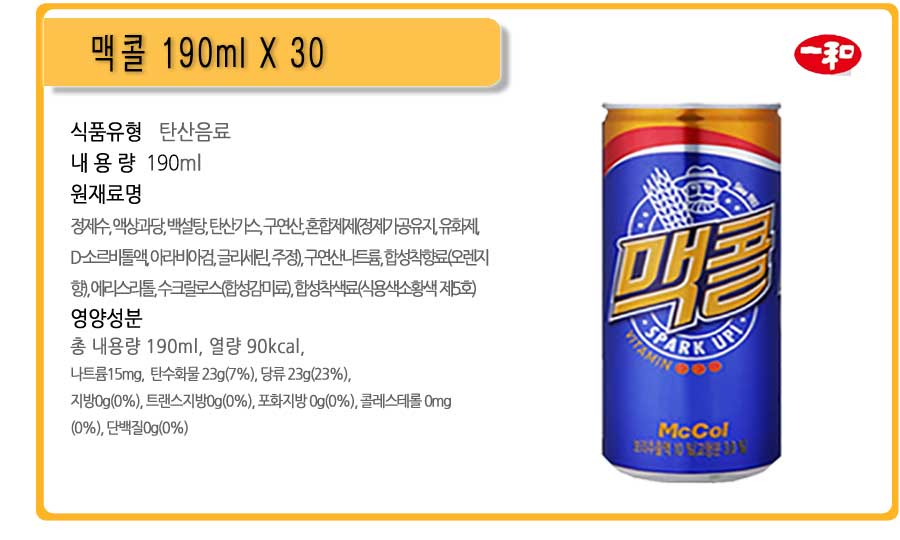 업소용콜라 미니캔 맥콜 190m X 30개 탄산 콜라 청량음료 보리음료 음료수 소캔 캔 업소용 탄산음료