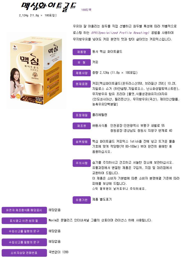화이트골드 커피스틱 11.7그램 180개입 4팩 세트 커피 음료 믹스 간편커피 커피세트 커피제품 음료믹스