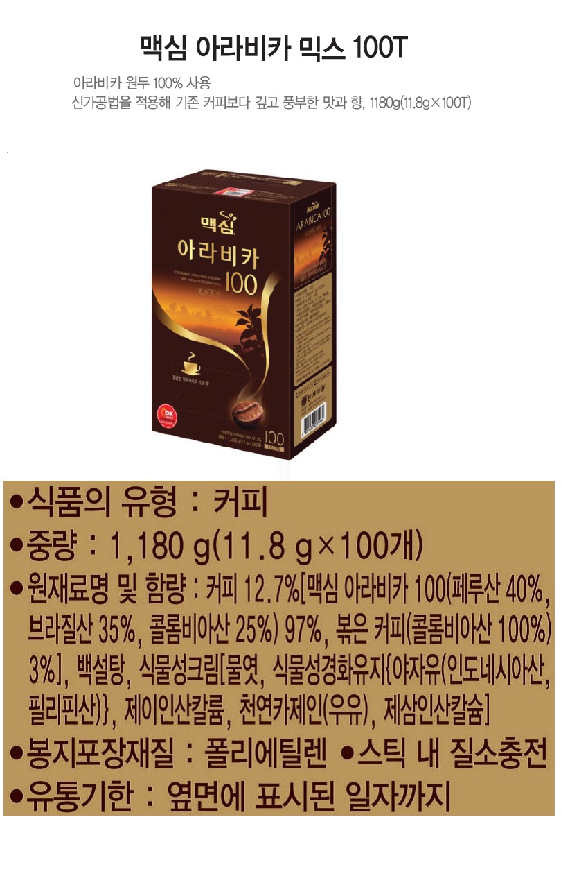 상품명 : 동서 맥심아라비카100커피믹스 11.8g x 100T