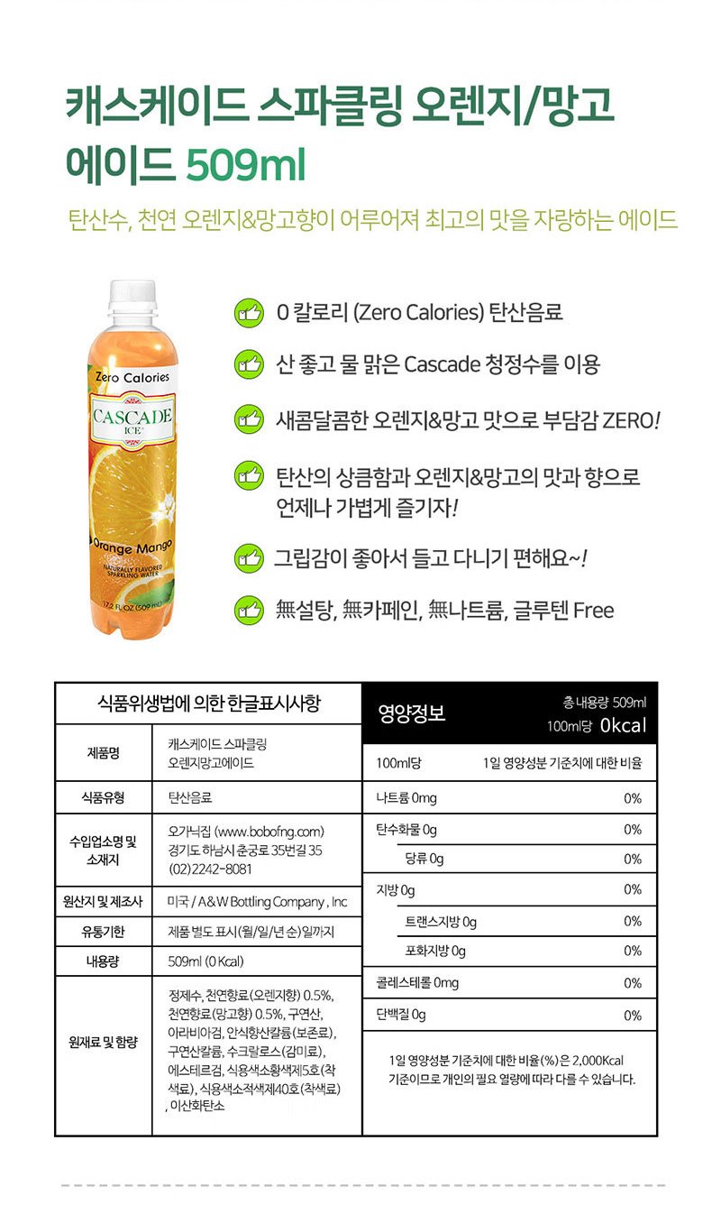(보보에프엔지)보보 캐스케이드 스파클링 오렌지 망고에이드 509ml x 12개 (1박스)