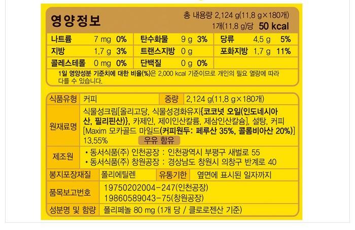 생산자 및 소재지(수입품의 경우 생산자, 수입자 및 제조국)동서식품(주)/대한민국/동서식품(주) 인천공장 : 인천광역시 부평구 새벌로 55