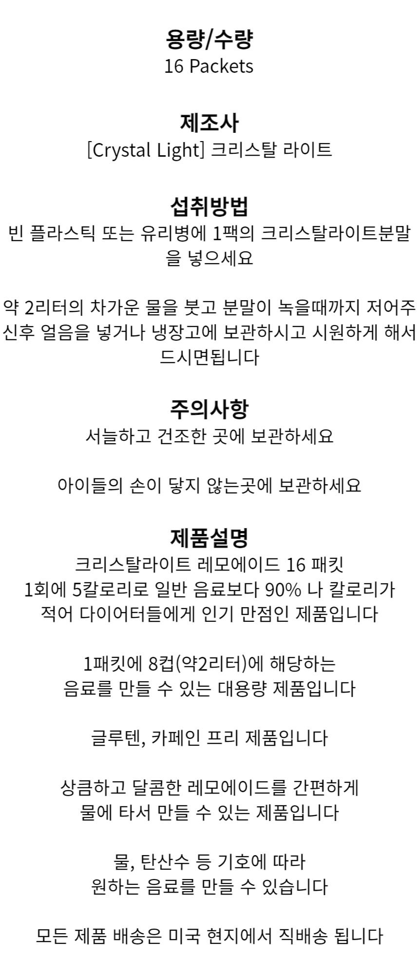 크리스탈 라이트 상큼 달콤 저칼로리 레몬에이드 16패킷 / 미국정품 빠른 직배송 / 중복구매 할인중
