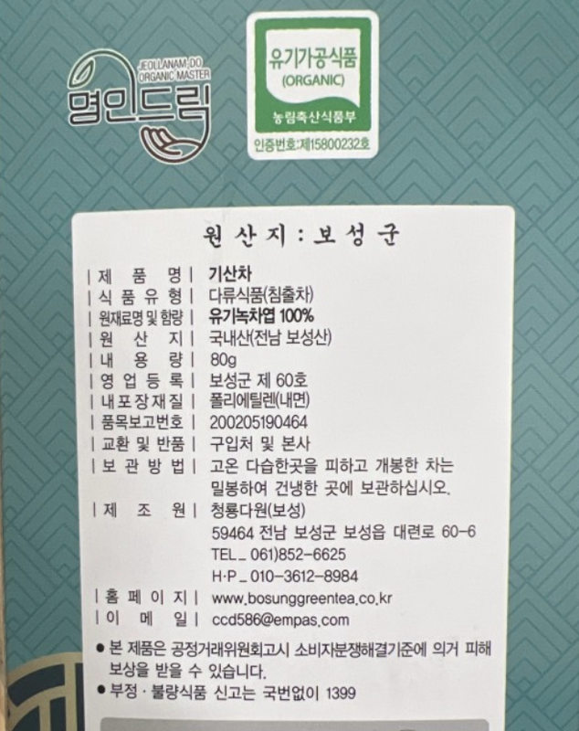 청룡다원 전남 보성녹차잎 유기농 어린잎녹차 기산차