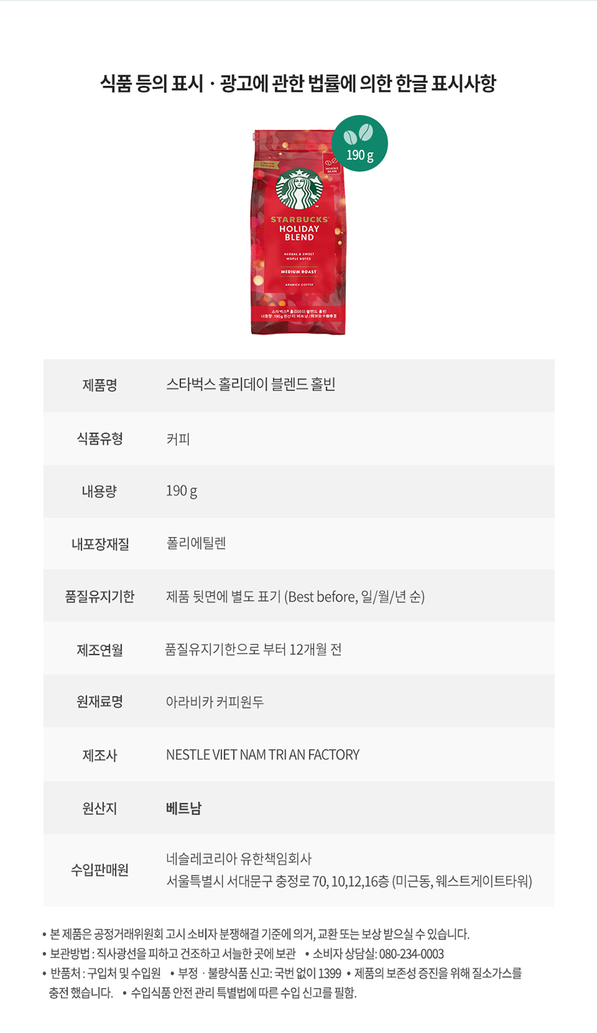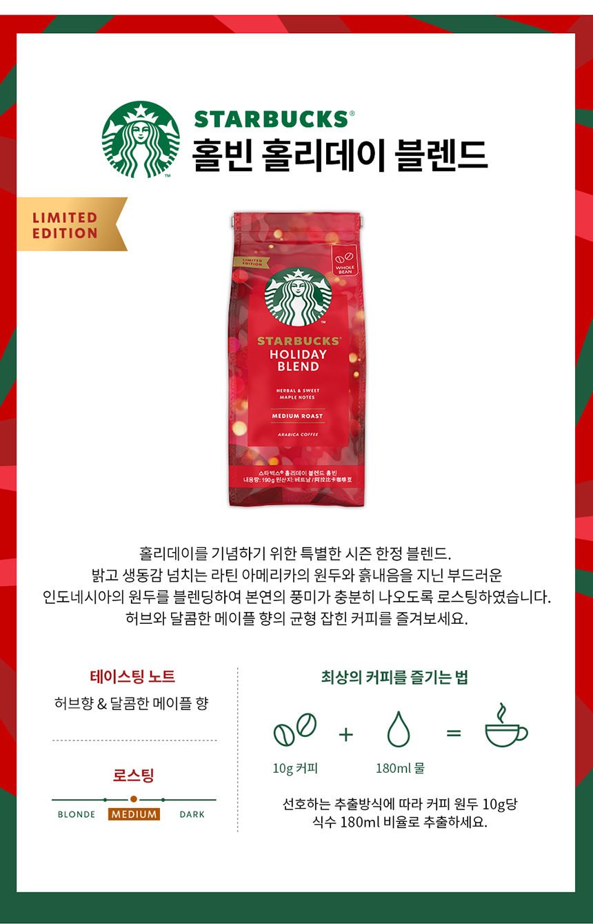 스타벅스 원두커피 홀리데이 블렌드 홀빈 190g