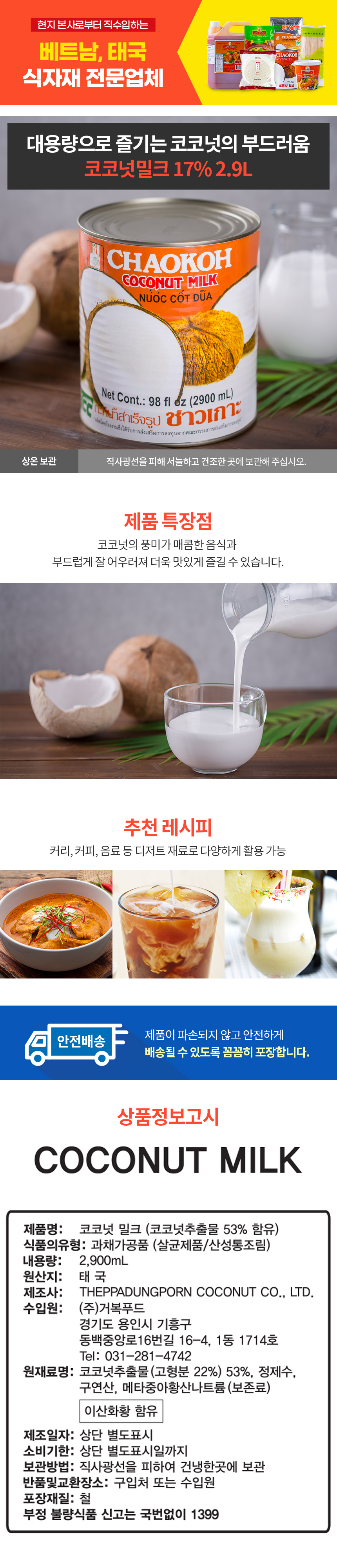 수입 코코넛밀크 통조림 17프로 2900ml 빙수 동남아 캔음료