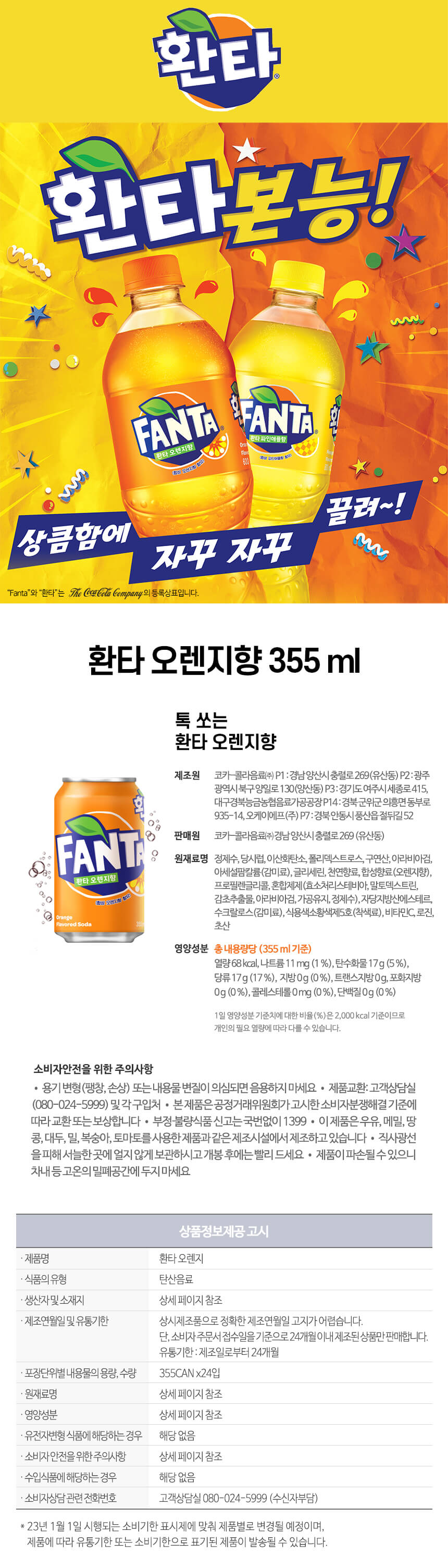 환타 오렌지 355ml x 24캔 뚱캔 탄산음료