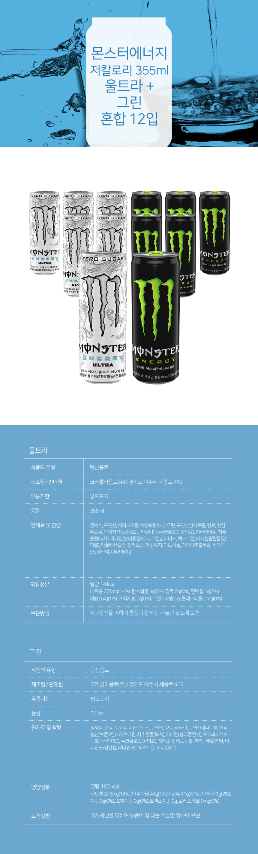몬스터에너지 저칼로리 355ml 울트라 + 그린 혼합 12입